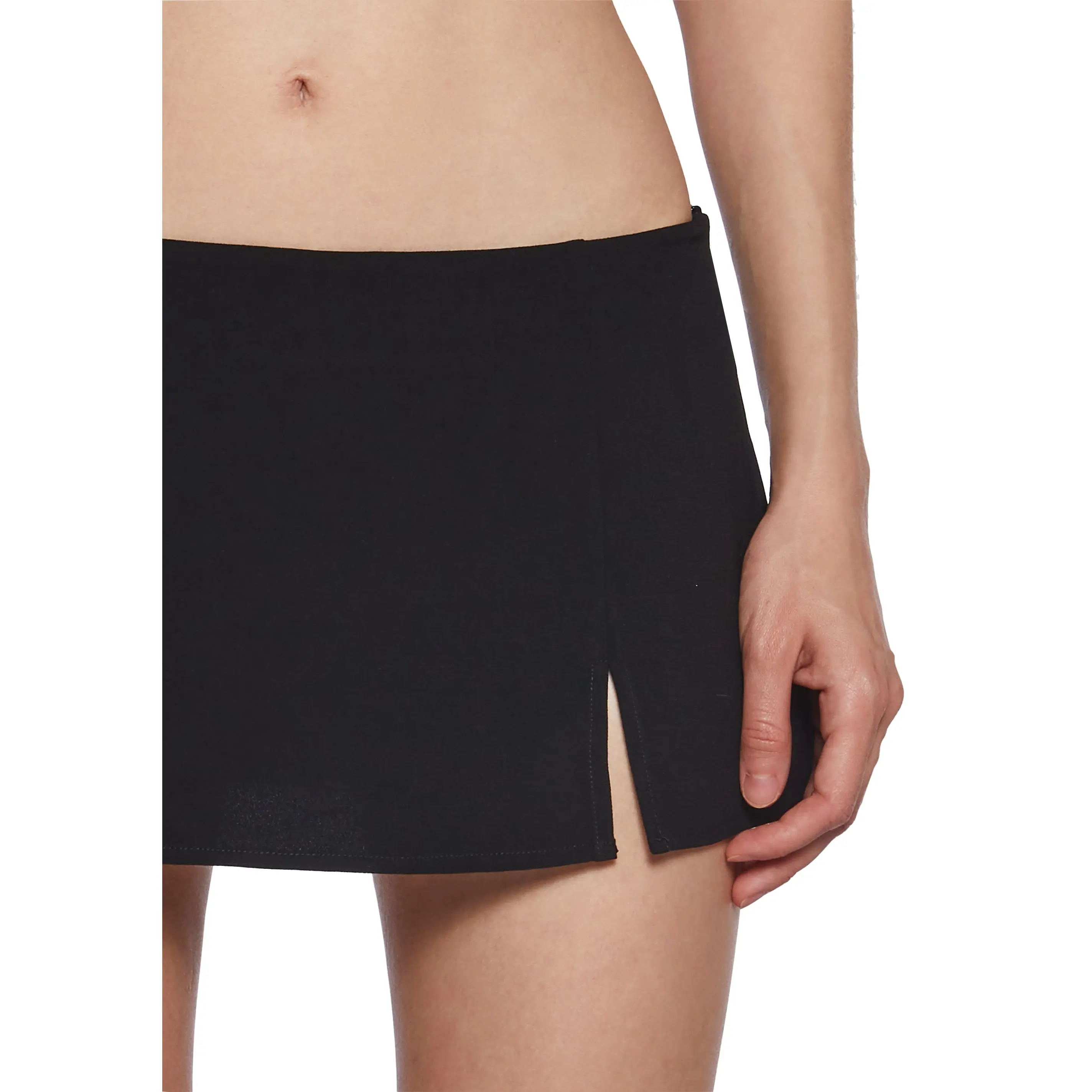This non-stretch micro skort has a low rise fit, a front slit, a built in panty, and a side zipper closure.