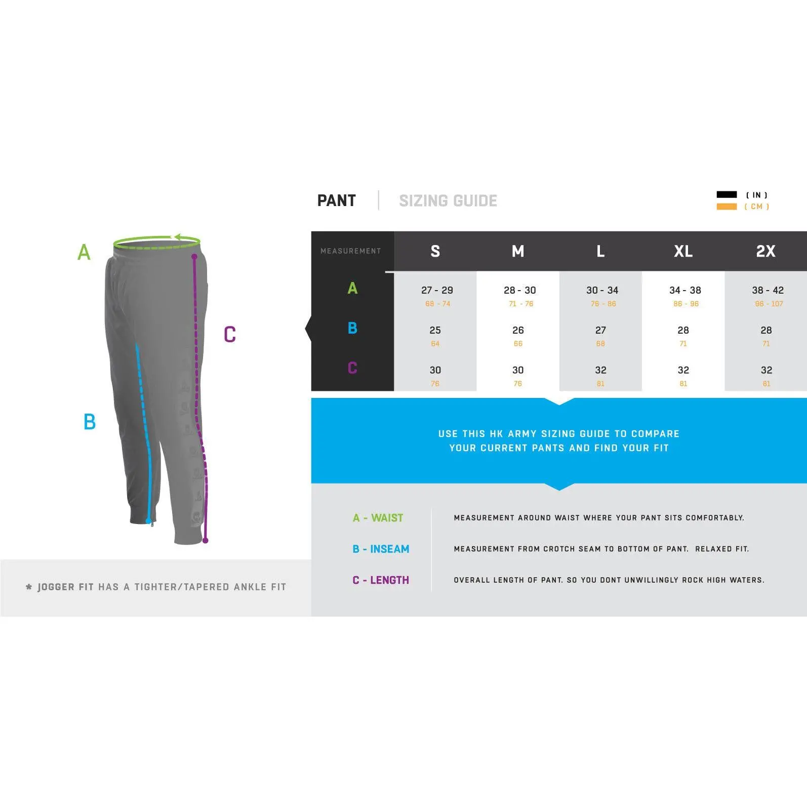 The fit is perfect. I have very long legs and was afraid they would be short in length but they are perfect in length and the fit and look is amazing. I love all my HK products and will order more joggers in the future.