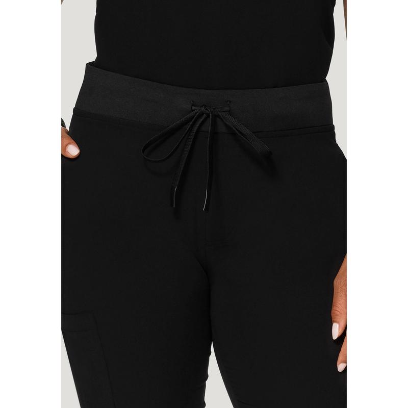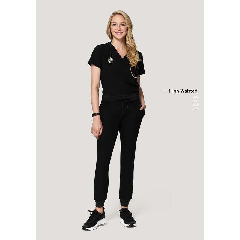 These high waist joggers are cut from spill resistant, 4-way stretch, breathable fabric and feature ribbed elastic ankle cuffs and 7 versatile pockets.