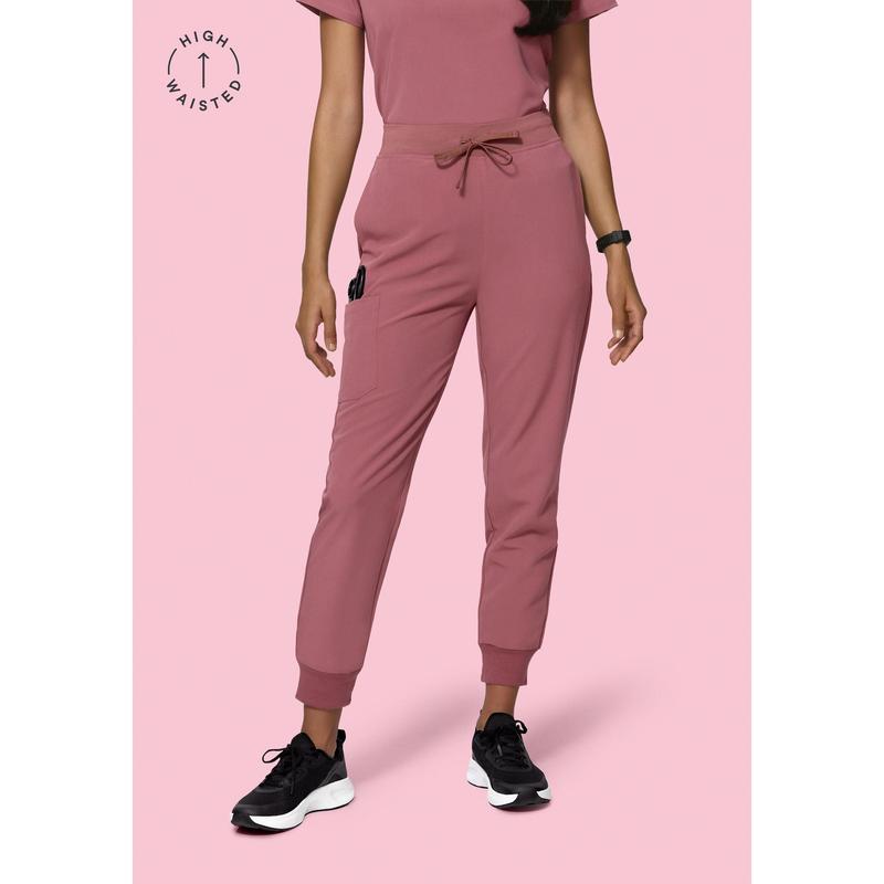 These high waist joggers are cut from spill resistant, 4-way stretch, breathable fabric and feature ribbed elastic ankle cuffs and 7 versatile pockets.