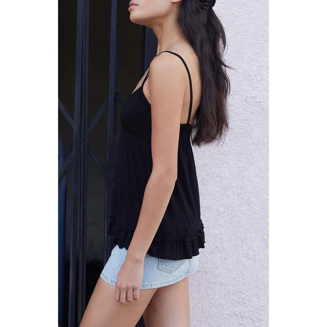 Cute, casual, and always on-point, the John Galt Black Babydoll Tank Top is a must-have. It features a V-neckline, fixed straps, a ruffled hem, and a flattering babydoll silhouette.