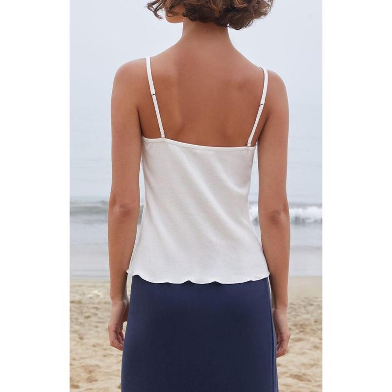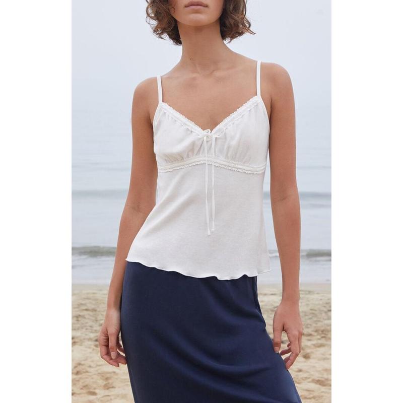 The White Arden Tank Top from John Galt is a flirty staple with a soft, vintage feel. It features a V-neckline with delicate lace trim, a tie front detail, adjustable straps, and a lettuce-edge hem for a sweet, laid-back finish.