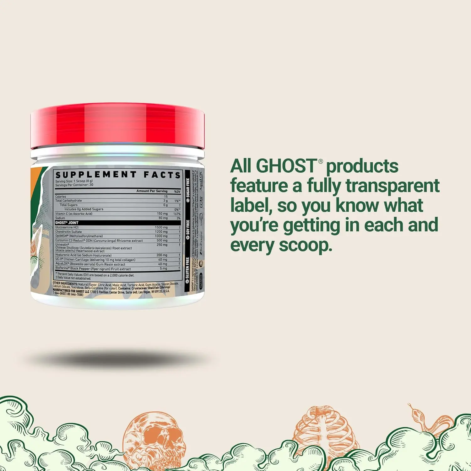 Each scoop of GHOST Joint features 1.5G Glucosamine HCl, 1.2G Chondroitin Sulfate,1G OptiMSM, and other legendary ingredients. It’s also gluten free, soy free, and sugar free.