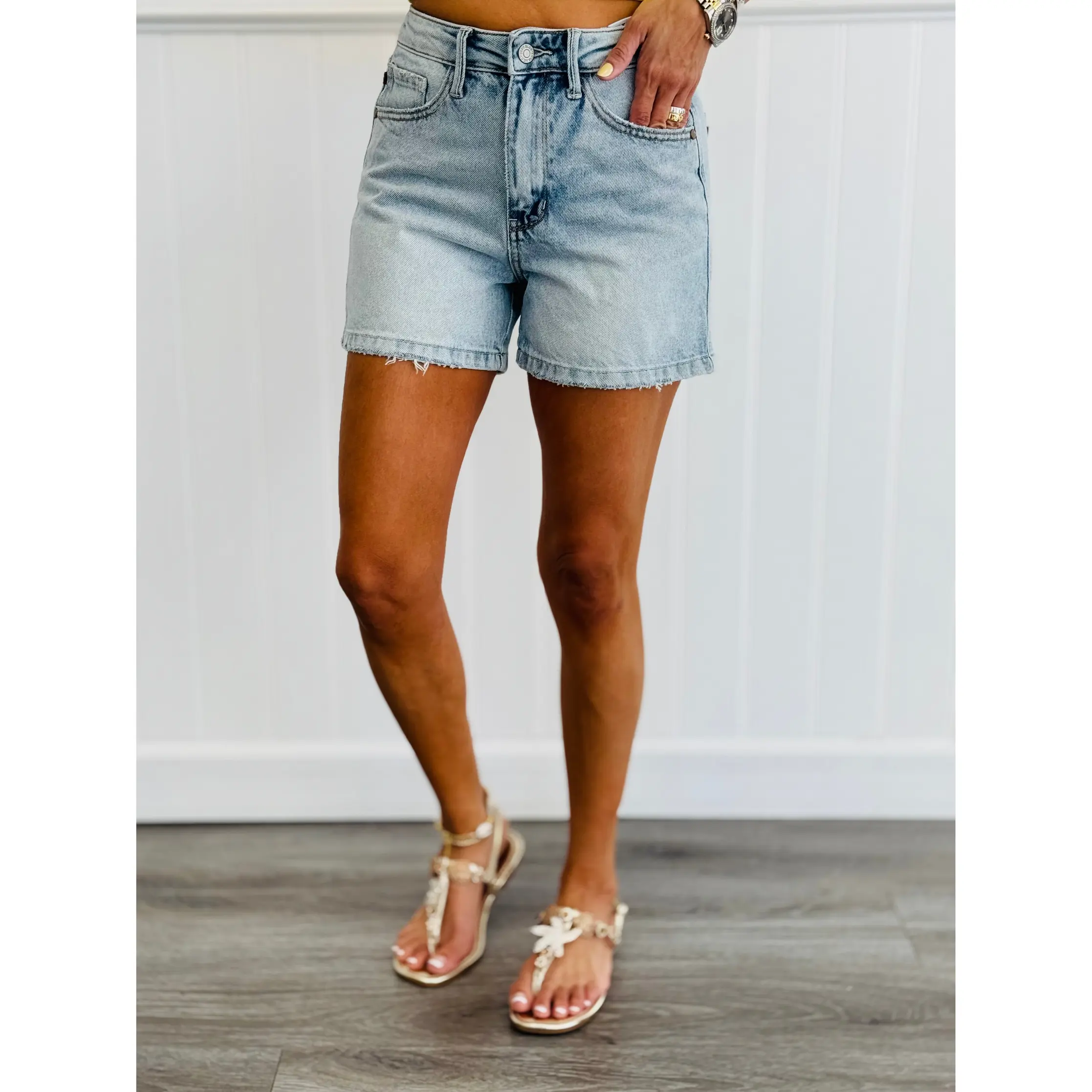 Love these shorts. They are not too short, high waist and it doesn't hug my thick thighs. Not your typical judy blue stretch but just enough it is comfortable. Hugs the tush in all the right areas.