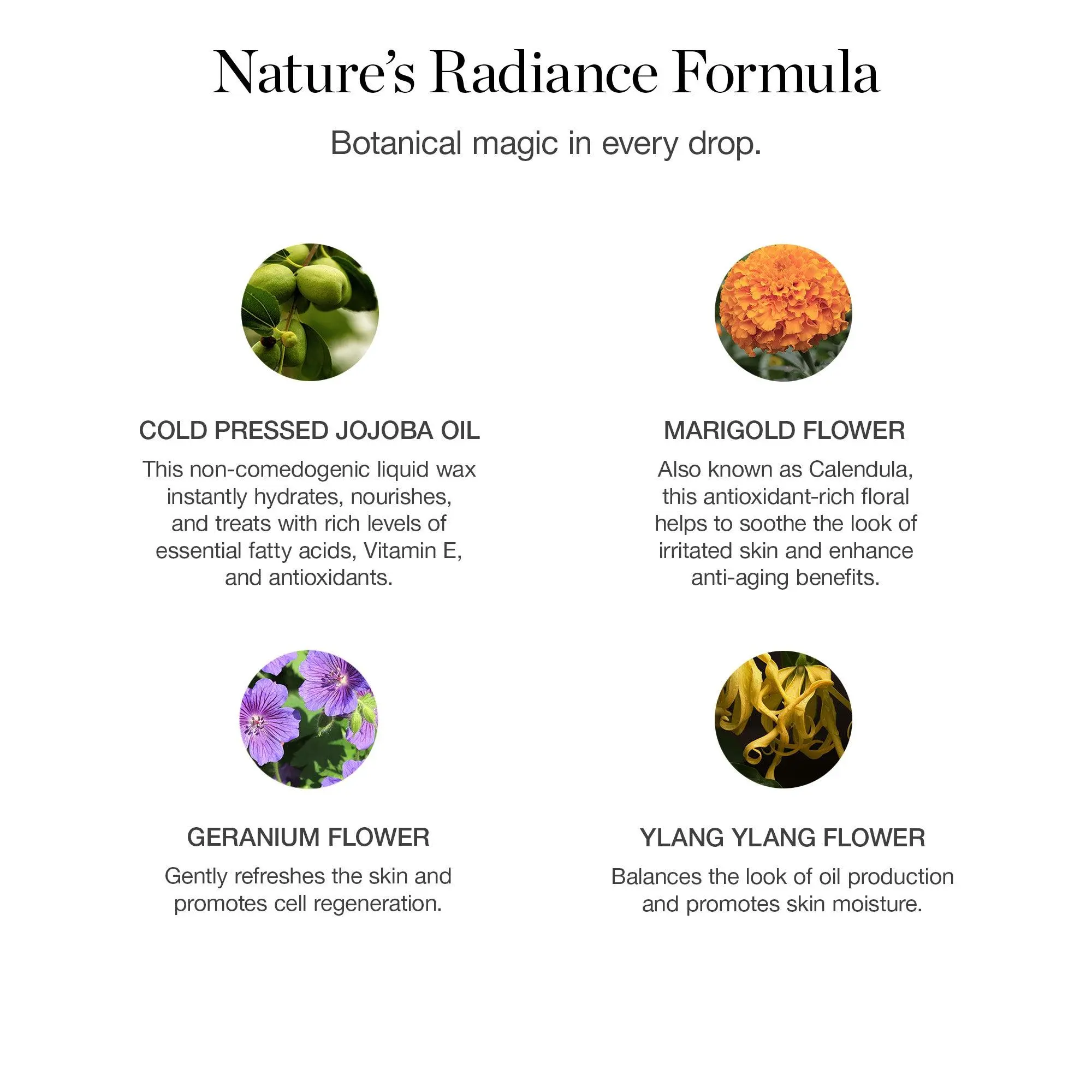 IngredientsSimmondsia Chinensis (Jojoba) Seed Oil*, Tocopherol (Vitamin E from Sunflower Oil), Cananga Odorata (Ylang-Ylang) Flower Oil, Geranium Maculatum (Geranium) Flower Oil, Tagetes Minuta (Marigold) Flower Oil, Artemisia Pallens (Davana) Flower Oil, Ferula Galbaniflua (Galbanum) Resin Oil, Geraniol**, Citronellol**, Linalool** *Certified Organic Ingredient **Naturally Occurring Component of Floral Essential Oils
