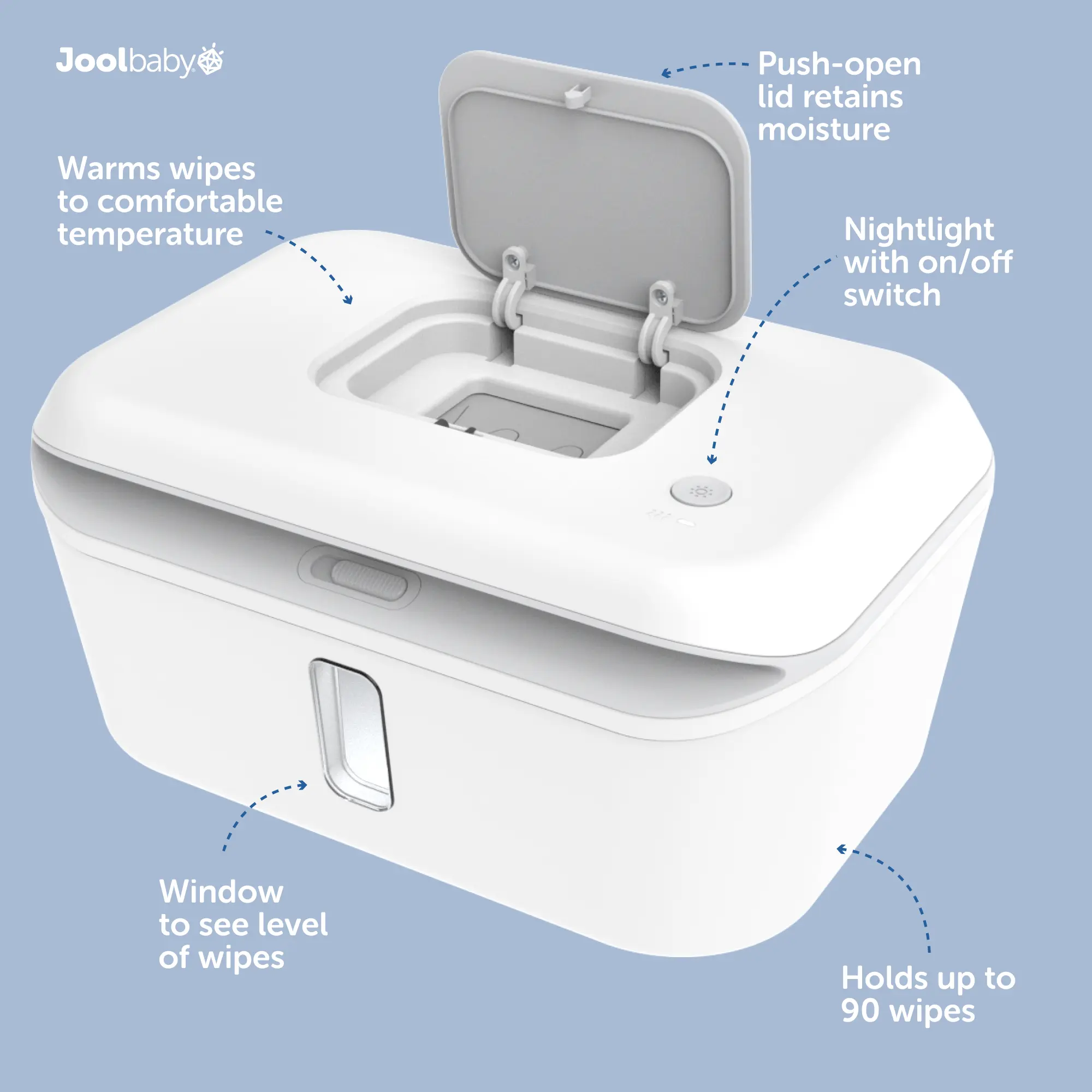 Sometimes all you need is a little warmth and a whole lotta love. The Jool Baby wipe warmer makes changing time more comfortable by taking the sting out of cold wipes. The soft light makes it perfect for changing diapers in the middle of the night. It also features a clear front window so you can see when the wipes need to be refilled. The wipe warmer is compatible with most standard wipes.