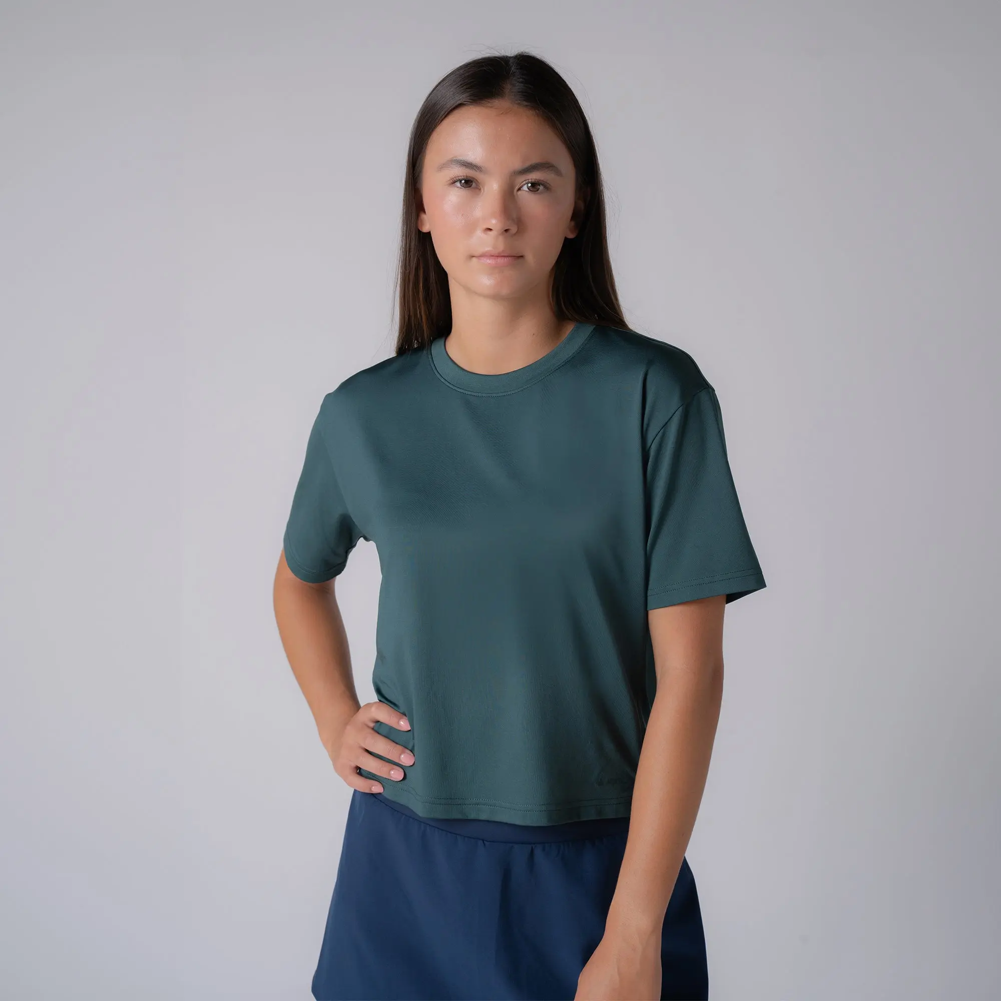 Cover baseline to the kitchen line and everywhere in between with full range of motion and style. With a slightly rolled forward side seam with side vent and 1" stepped hem detail, JOOLA women's pickleball crop tee allows for fluidity and comfort. This lightweight, quick-drying, moisture-wicking and UPF 50 protective top is a great piece to start your JOOLA Pickleball apparel collection.