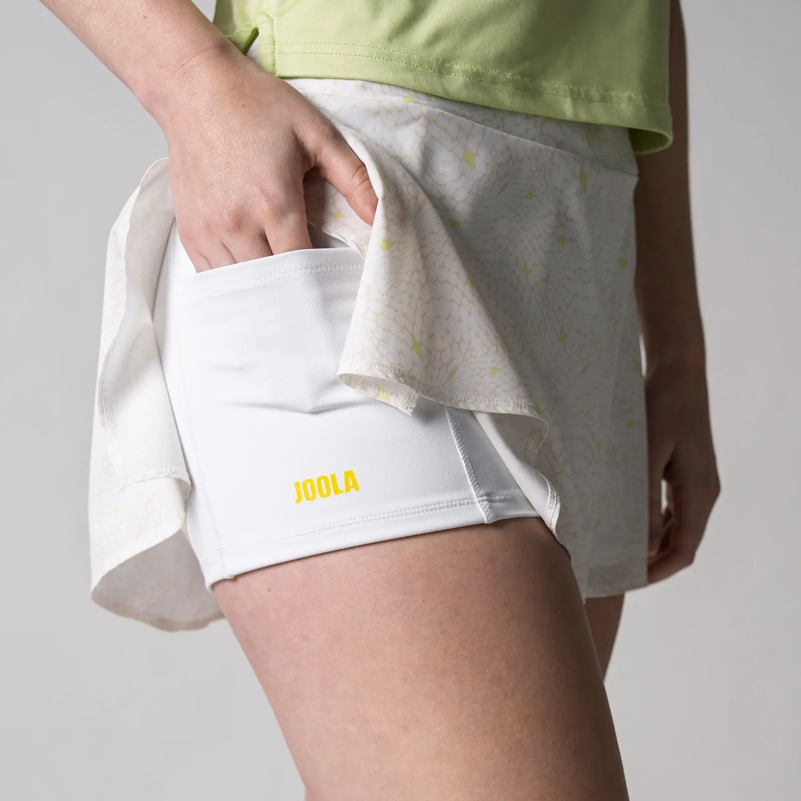 Can your pickleball game be any more fun?  In the JOOLA women’s printed pickleball skort we certainly think so.  Express your love for pickleball in a skort designed with the player who likes to have fun.  This 13” midrise skort features a slight drop tail, overlapping sides for easy lateral motion, and a built in under short for coverage.