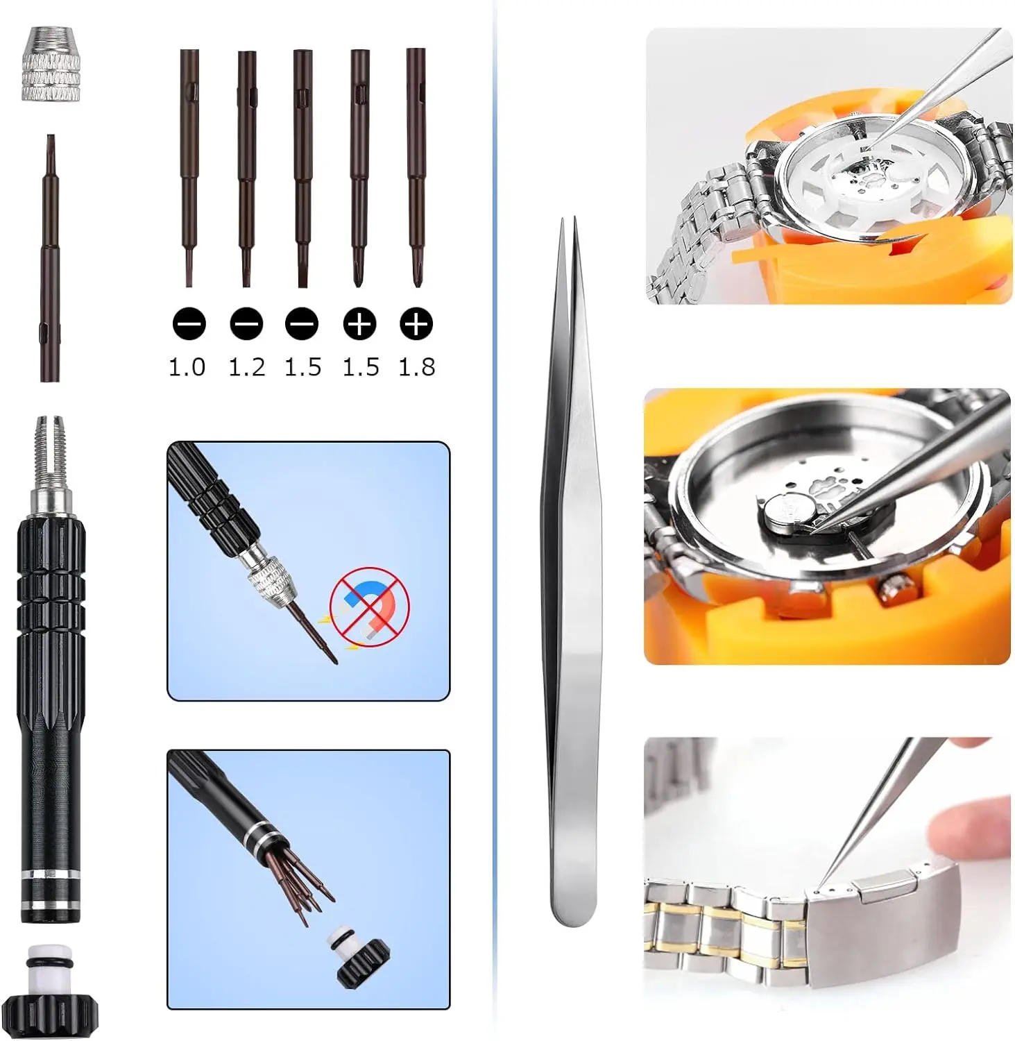 ·【Five-in-one watch screwdriver】-- Five types of screwdriver bits are suitable for many situations: watch battery fixing screws, watch case screws, watchband screws, and can also be used for glasses screws. The cover at the end of the screwdriver can be opened, and the inside is hollow for storing other screwdriver bits.