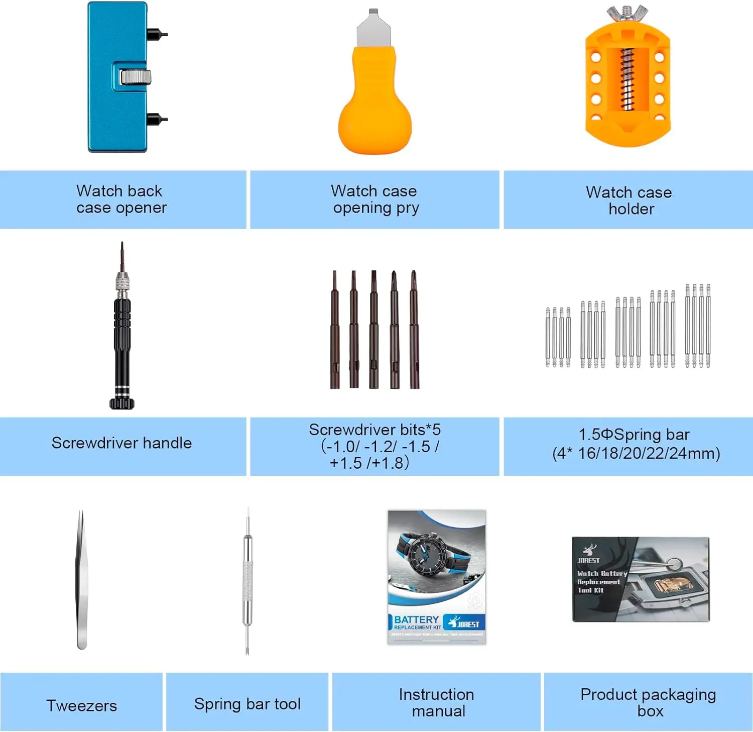 JOREST Watch Battery Replacement Tool Kit is perfect for opening watch back cases, watch battery & strap replacement, jewelry work, eye glasses repair and electronics repair.