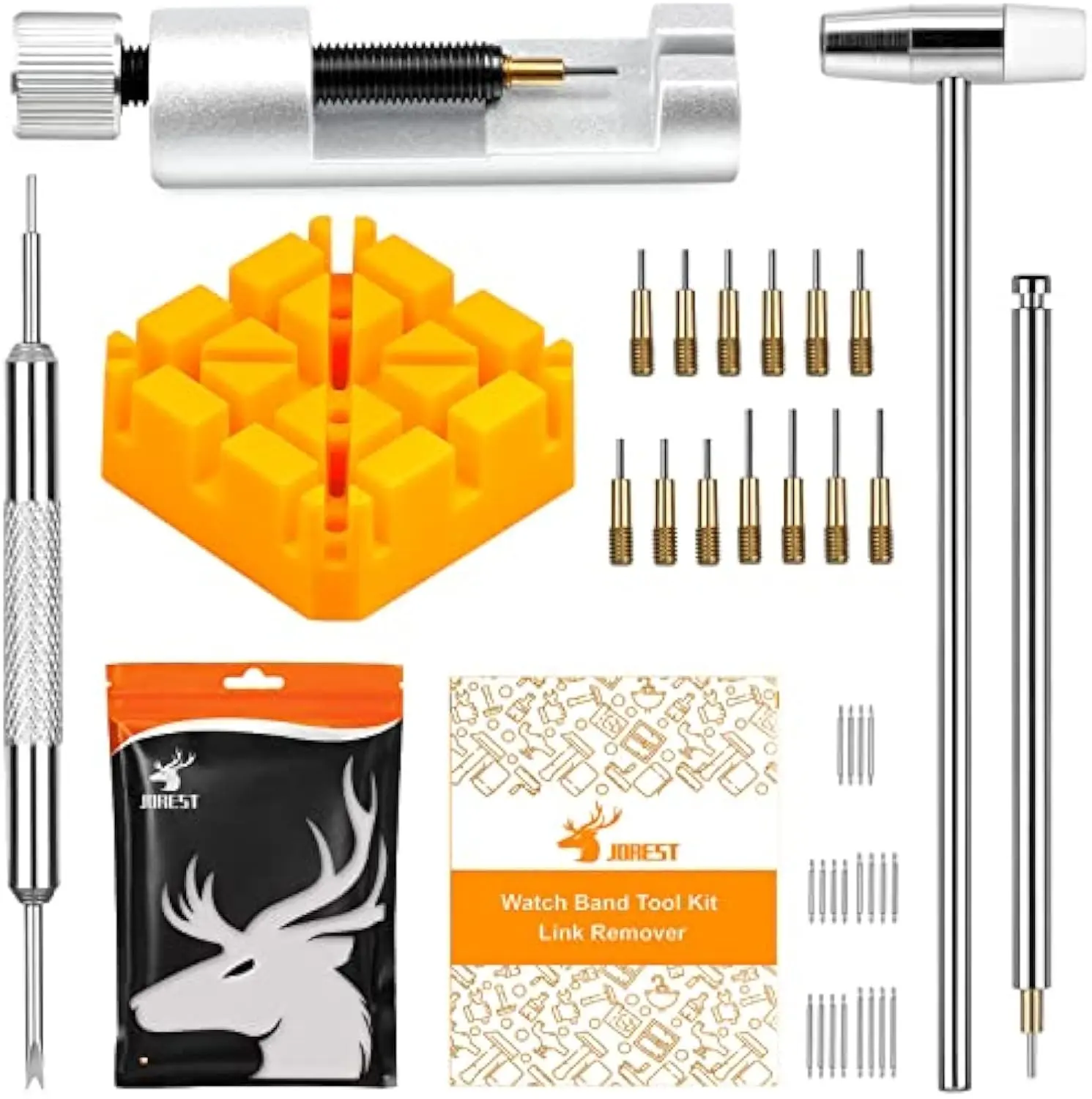 ·【Watch strap adjustment kit】-- The kit includes a metal watch band link remover, a pin punch , a strap replacement tool, a double-headed hammer, a watch band holder, 13PCS spare needles, 20PCS of 1.5Φ spring bars (4* 16/18/20/22/24mm) and an instruction manual.