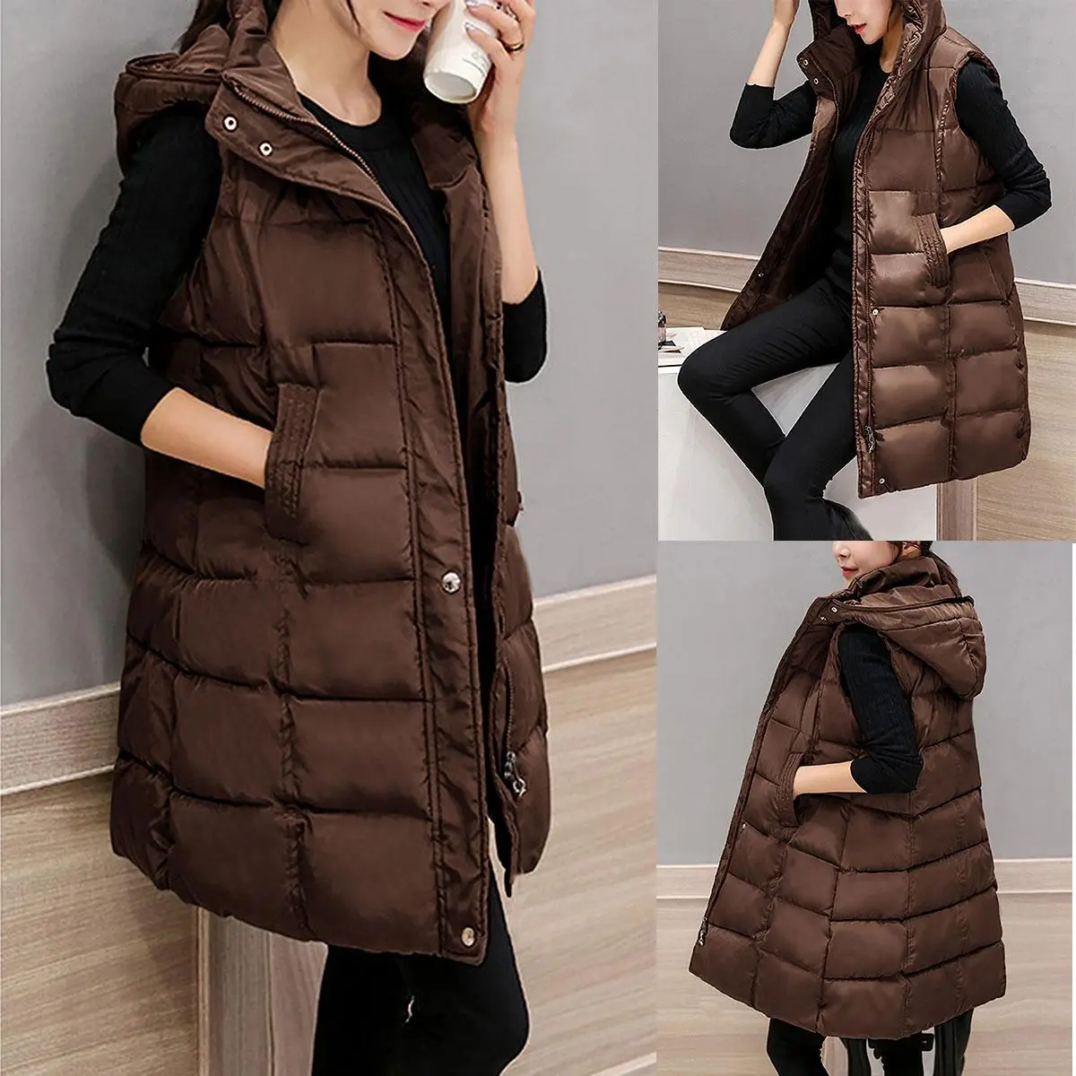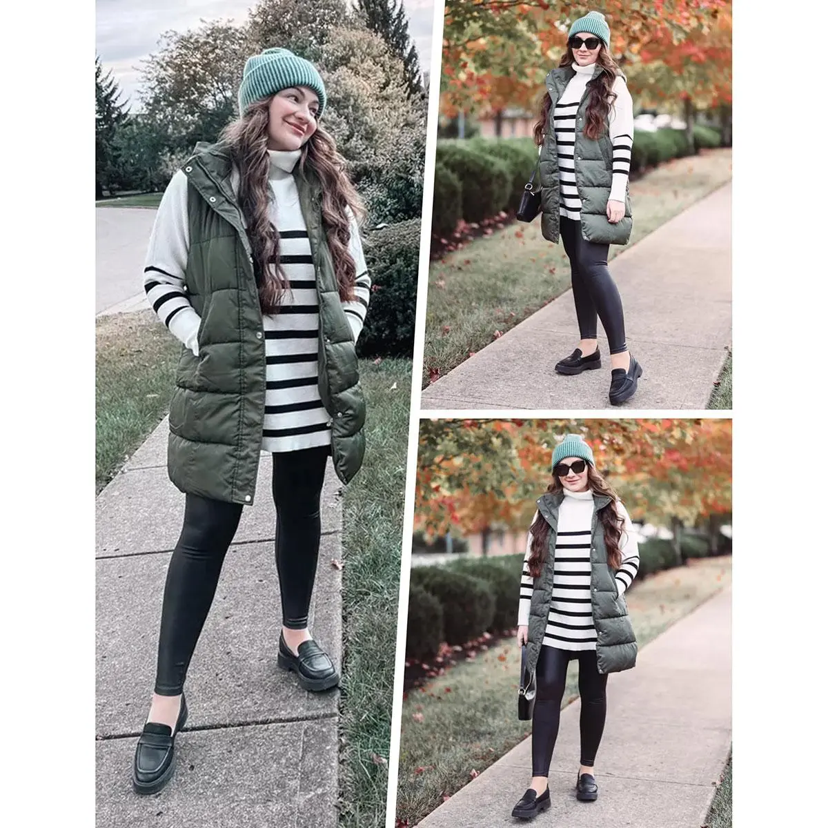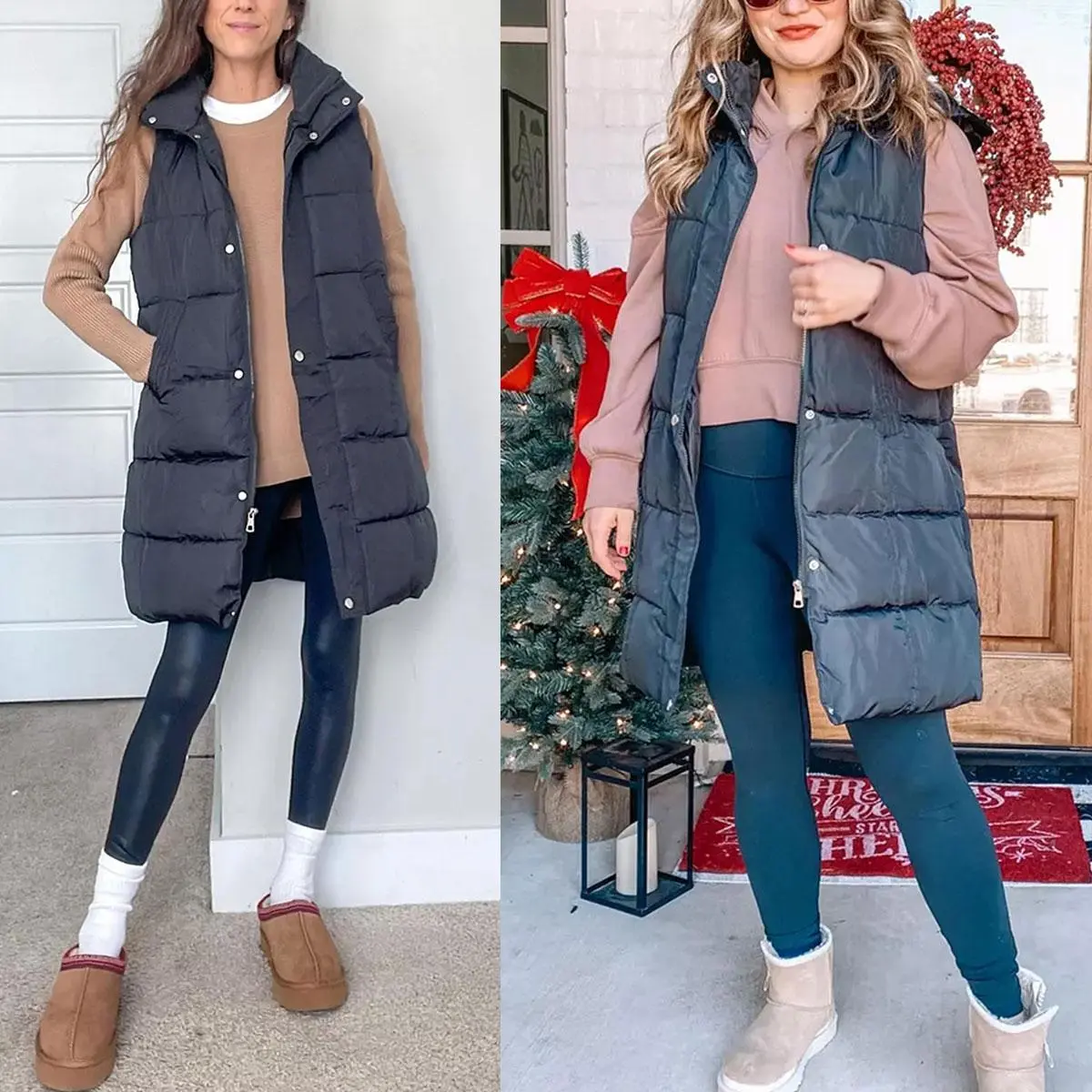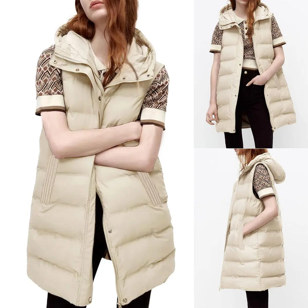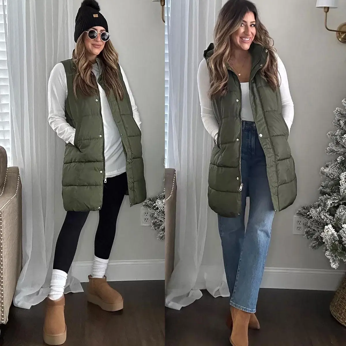 ·The JovenPara Women's Long Puffer Vest is a sleeveless puffy jacket. It features a removable hood, offering versatility in styling. 🌟