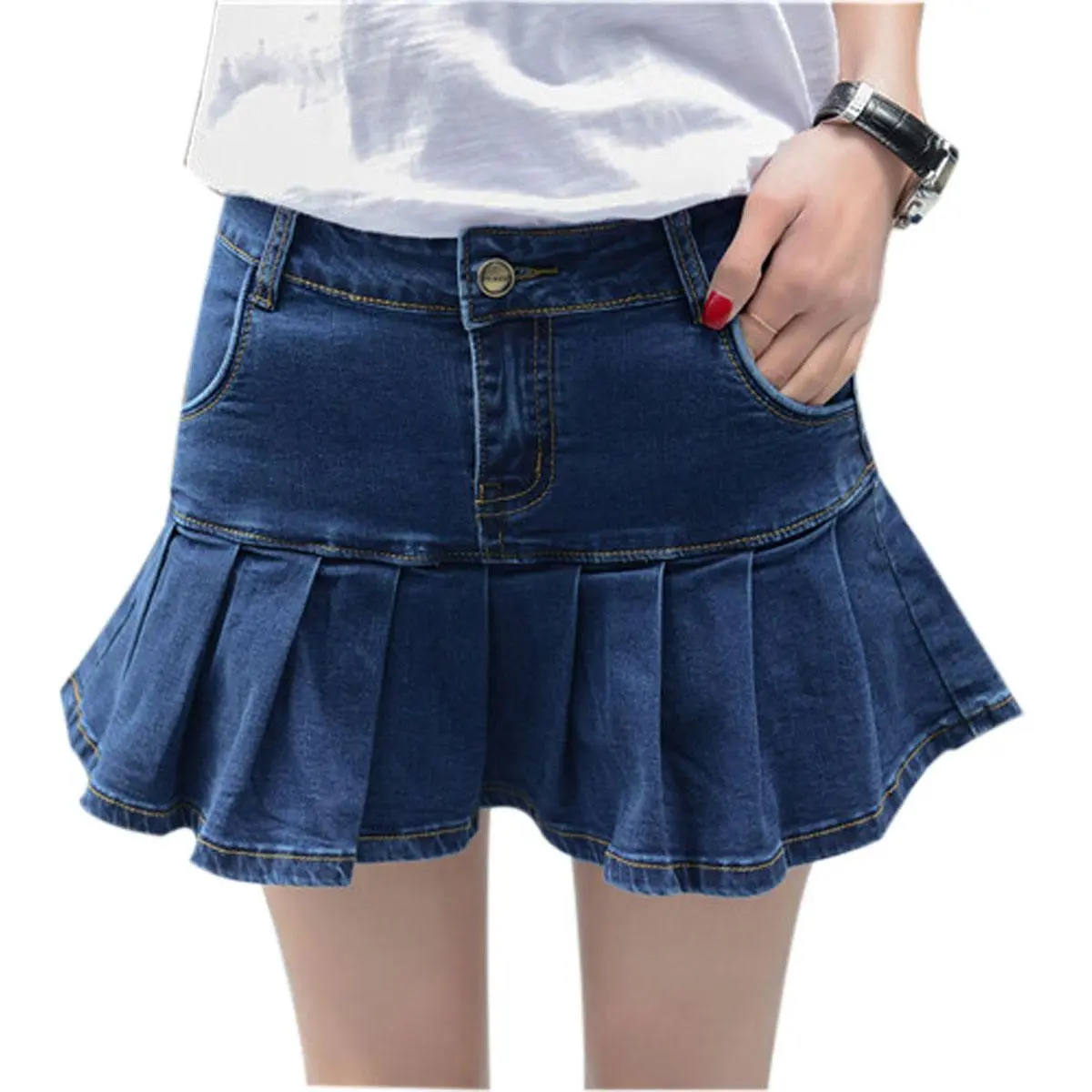 Elevate your style with the JovenPara Women's Short Denim Skirt. This slim A-line skirt features pleated ruffle details, adding a touch of elegance. The built-in shorts provide added comfort and versatility. Perfect for Y2K fashion enthusiasts, this mini Jean skirt is a must-have.