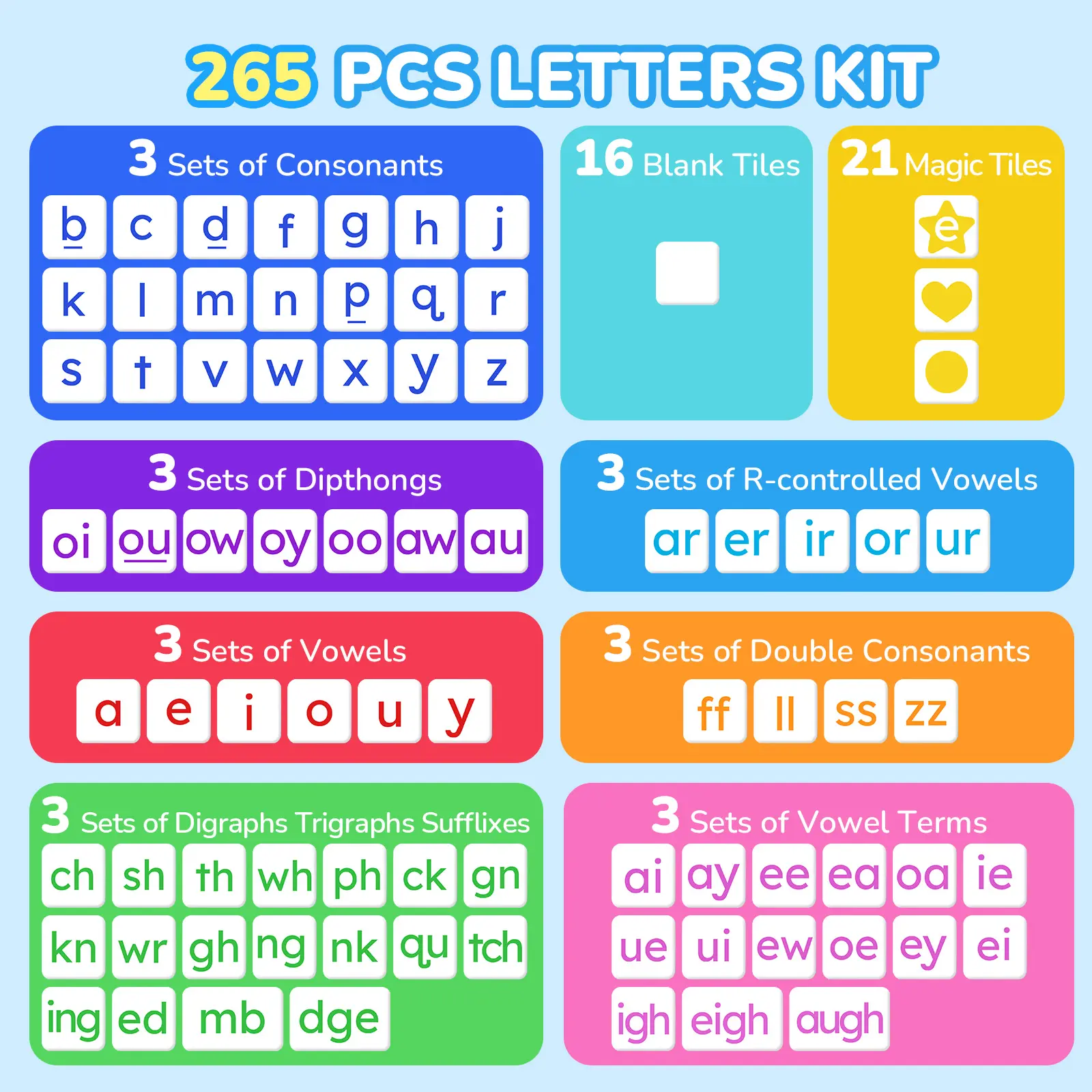 ·Endless Word-Building Possibilities: With 249 grapheme tiles and 16 blank tiles, kids can spell countless words, practice phonics, and create sentences. Perfect for ages 5-8 to explore language in a fun, hands-on way!
