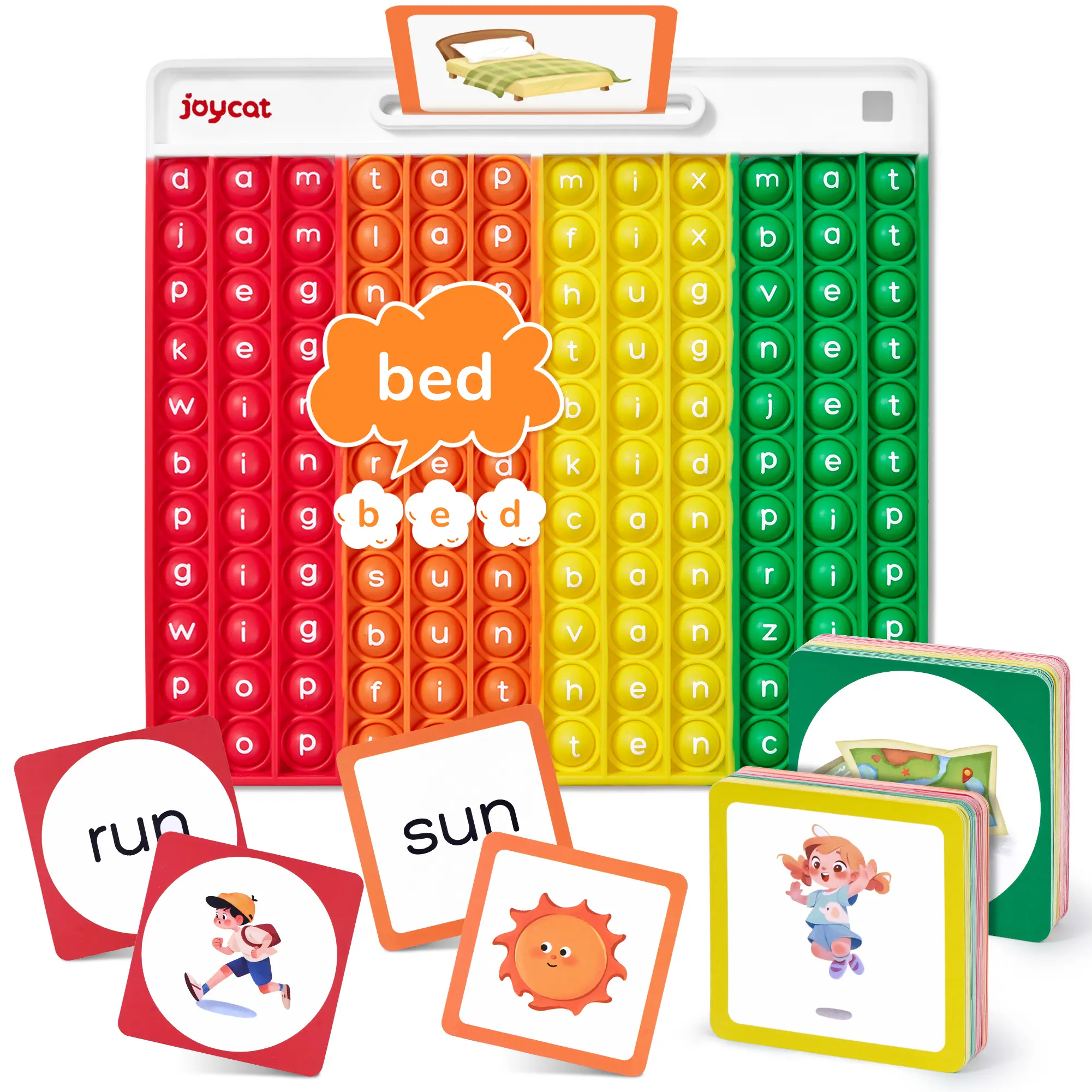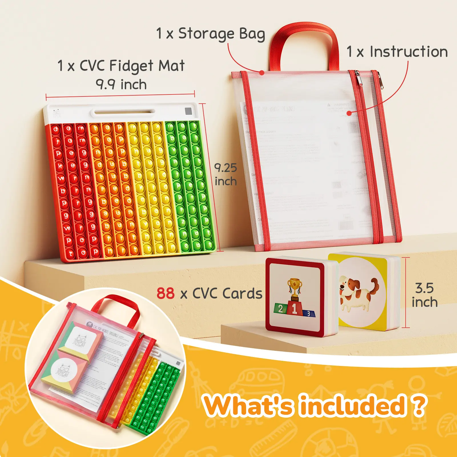 The CVC word game includes a bubble mat and 88 CVC words cards. Using sturdy and safety material, the bubble mat is non-toxic and comfortable to use, the flashcards are printed in thick cardstocks that cover a splashproof PET film to ensure long-time use. It will also have a storage box to help children store their learning toys.