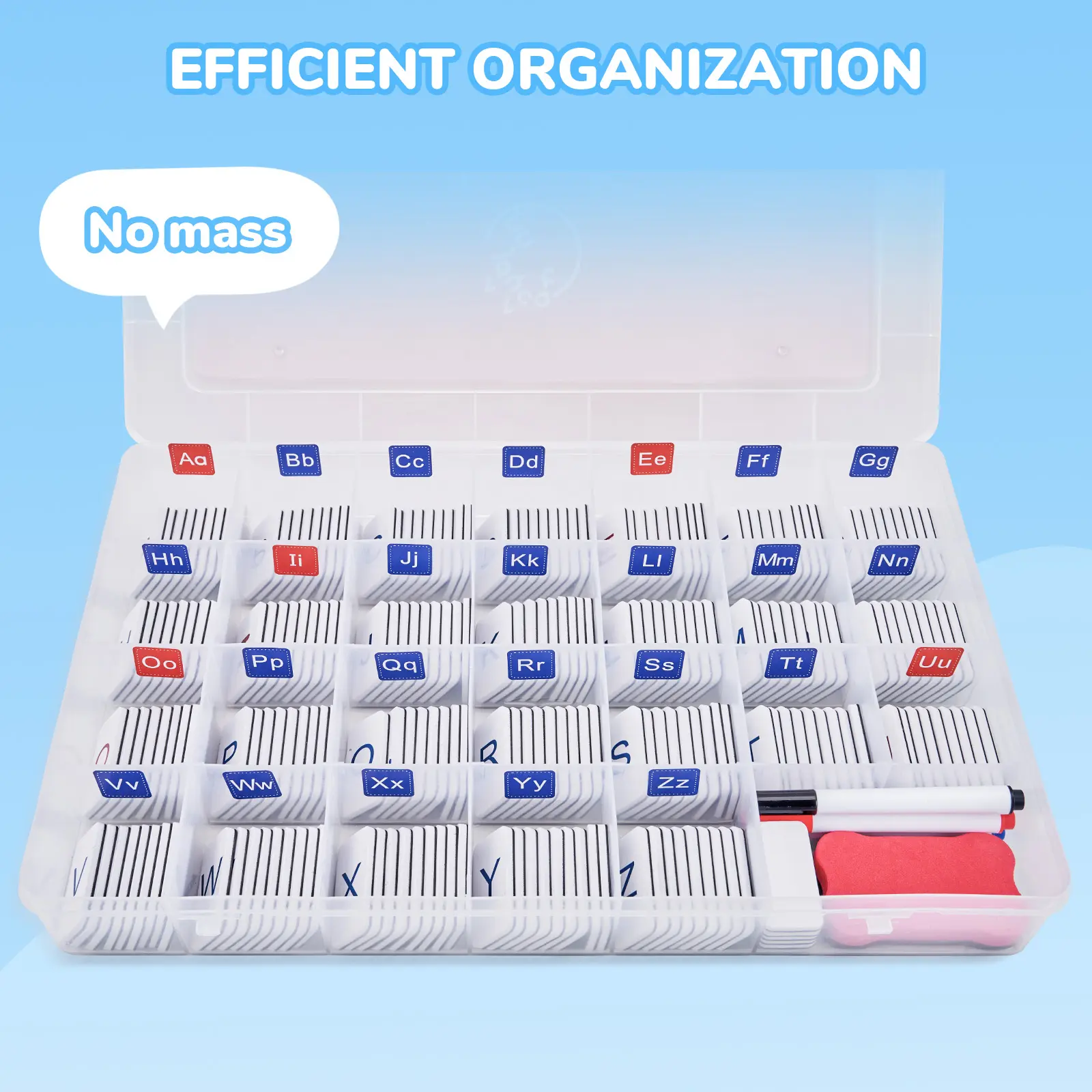 Keeping all 240 pieces organized is effortless with our specially designed plastic storage case. Each letter finds its home in one of the 27 clearly labeled compartments, making accessibility and visibility straightforward for learners.