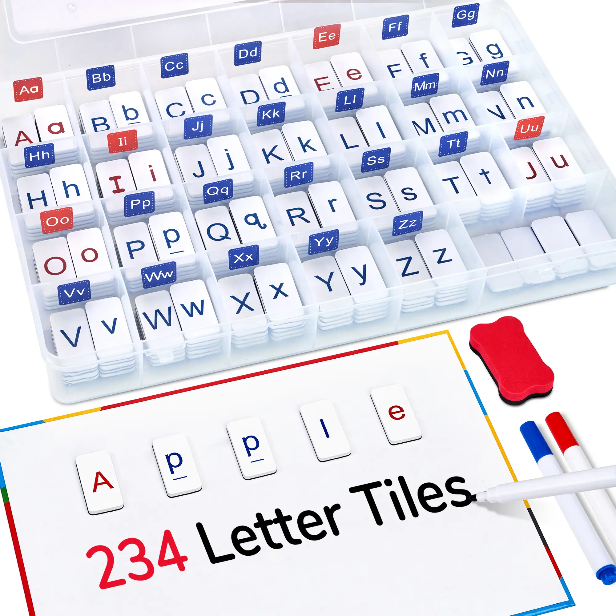 This Letter set boasts a total of 234 magnetic letter tiles, including 52 uppercase and 182 lowercase letters, accompanied by 6 blank tiles for extra word-building usage. Designed for children in any stages.
