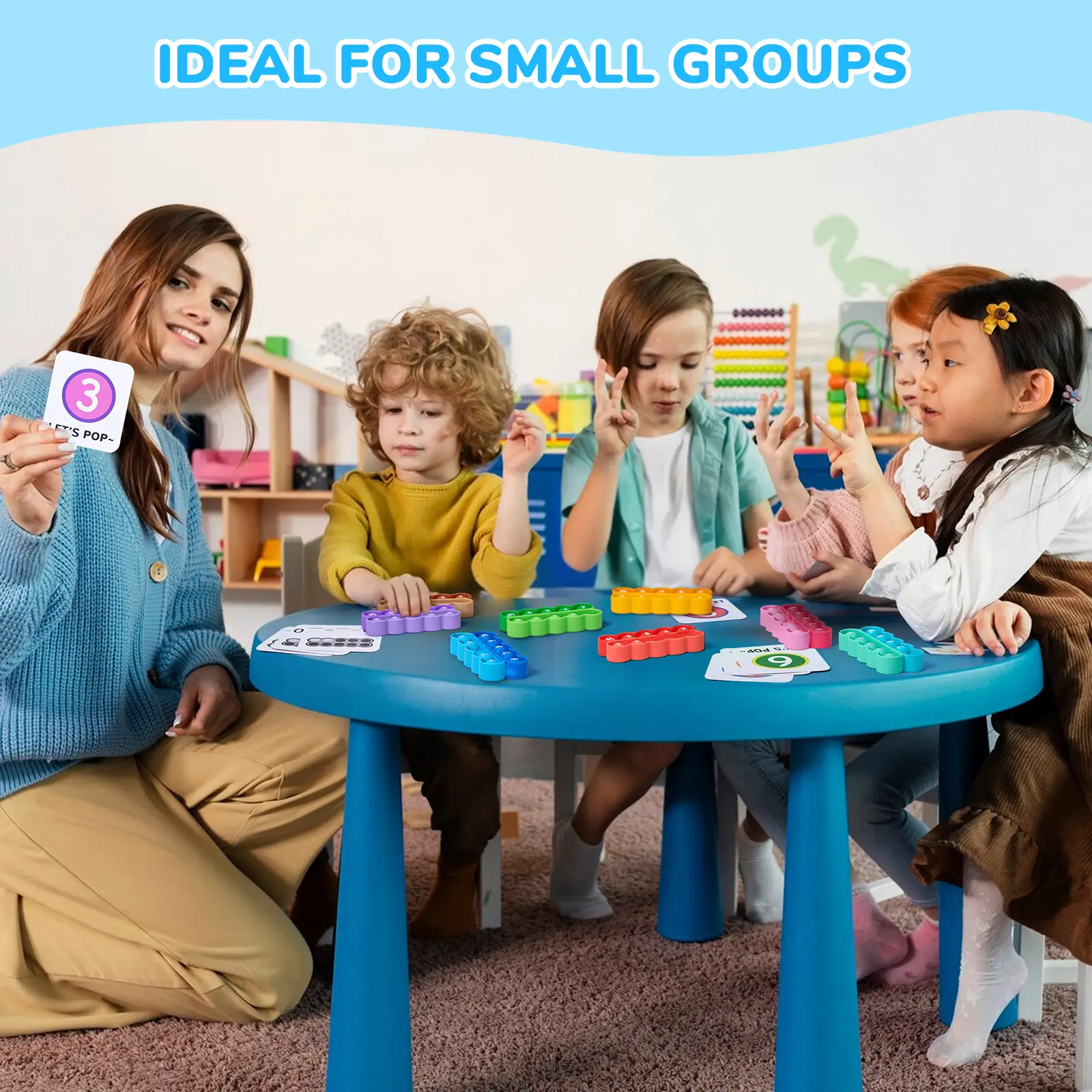 The set includes 8 different colored ten-frame board toys. Also included is a set of 20 task cards that can be used in the classroom for teacher-student interaction to facilitate a game or a quick review of the concepts covered.