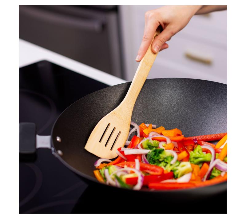 ·Includes 18" mixing spoon, 15" mixing spoon, 12" mixing spoon, 9" rice paddle, 15" spatula, 13" spatula, 13" slotted spatula, 13" all-purpose spatula, 6.5" toaster tongs, 11" tongs, and 14" stir fry spatula