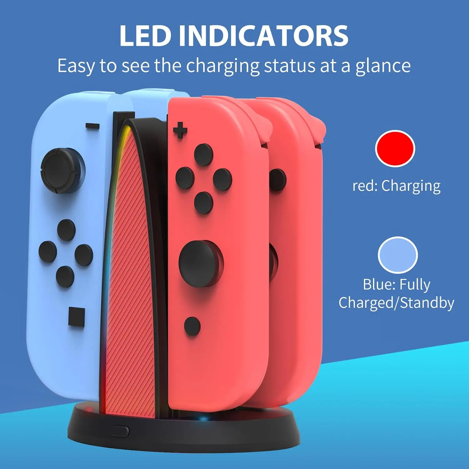 Easy to Use: Simply slide your joycon controllers down and wait for the LED indicators to turn blue when fully charged.