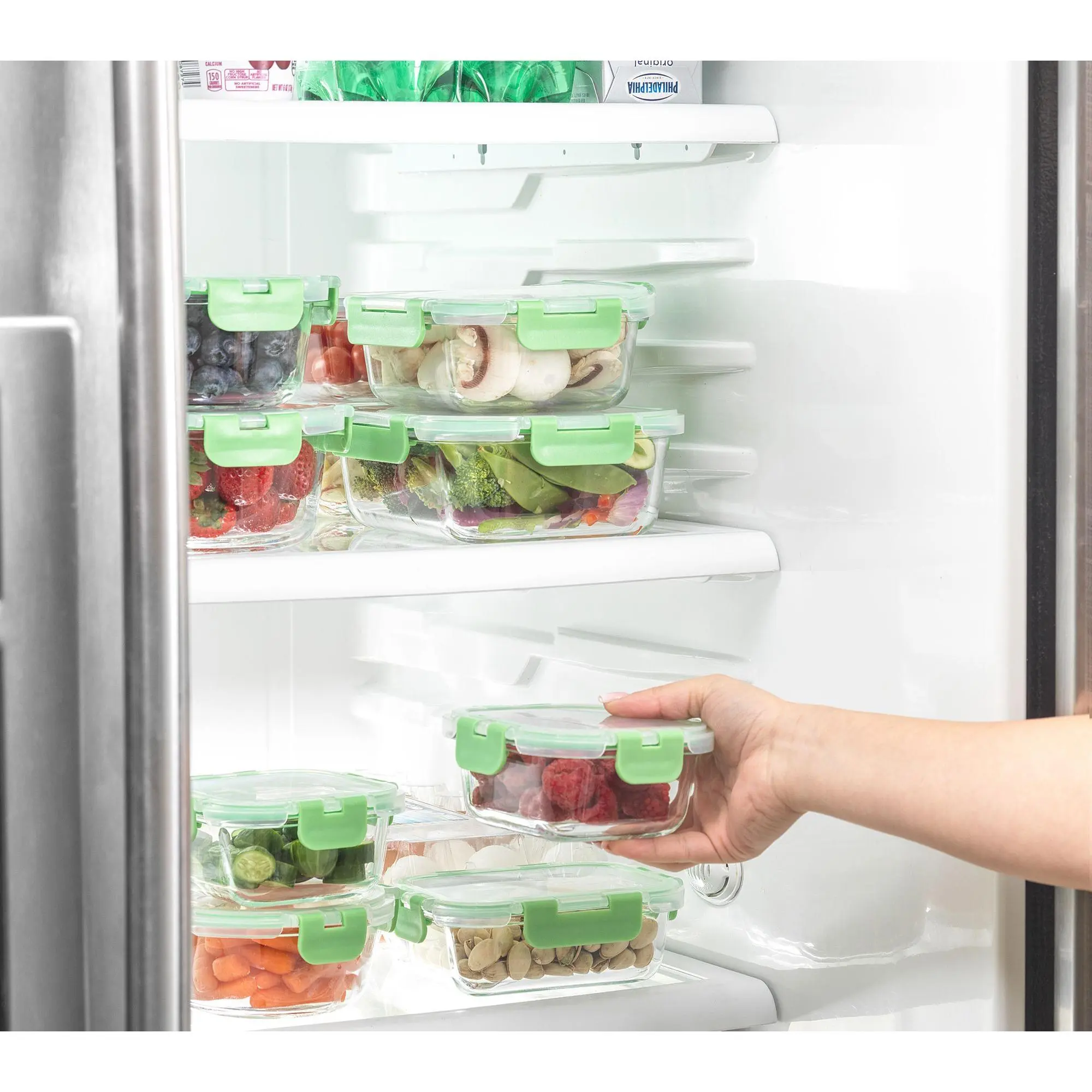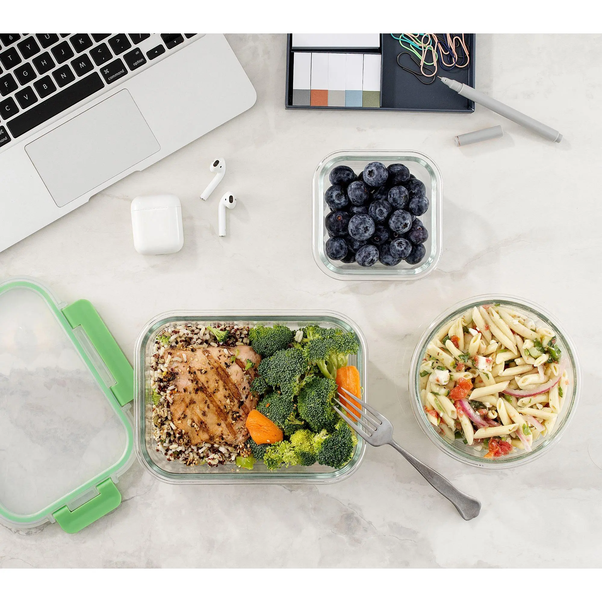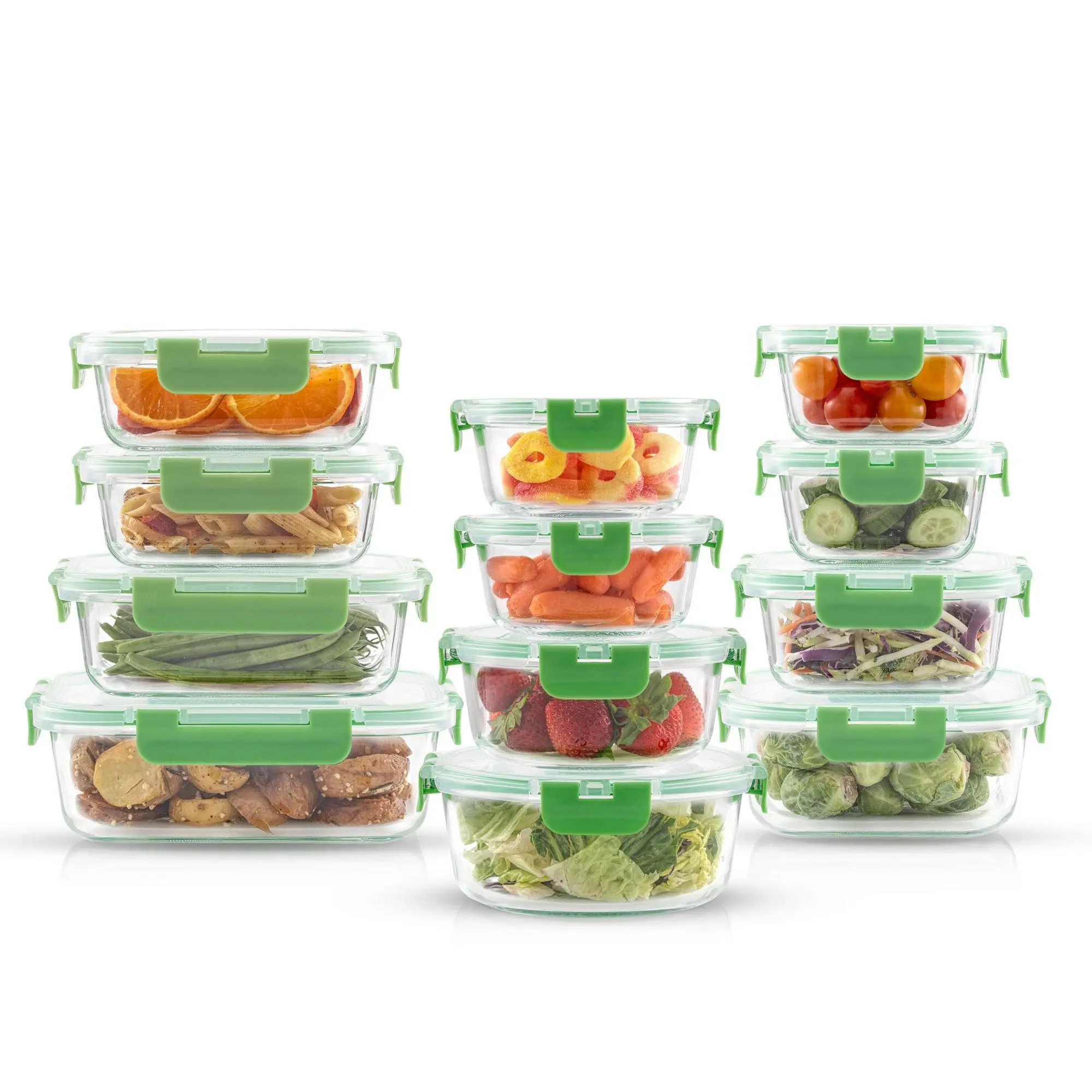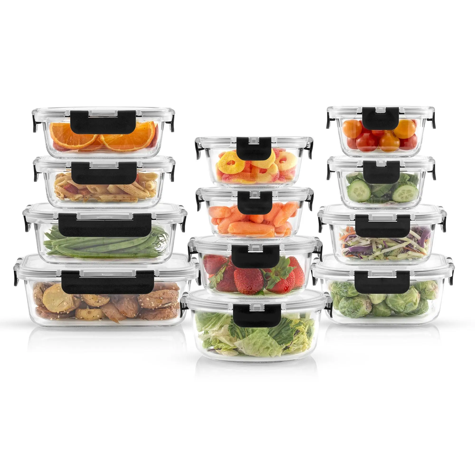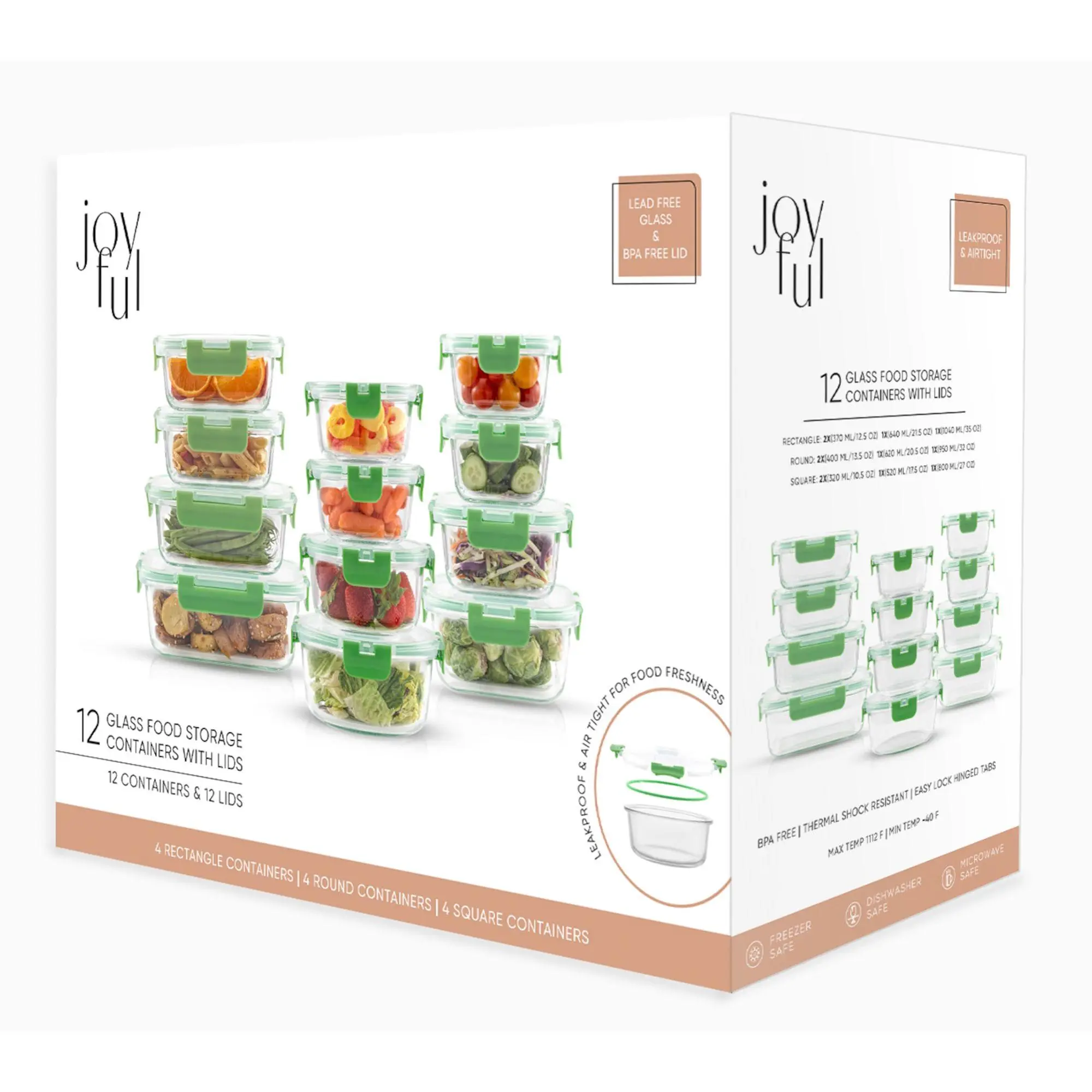 ·Includes 35-oz rectangle container, 21-oz rectangle container, two 12-oz rectangle containers, 27-oz square container, 17.5-oz square container, two 11-oz square containers, 32-oz round container, 21-oz round, container, and two 13.5-oz round containers, each with lids