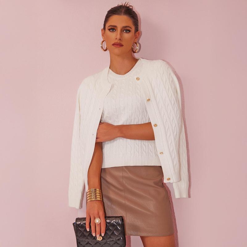 Elevate your knitwear collection with our Cable Knit Short - Sleeve Top & Asymmetric Cardigan Set. This stylish two - piece set features a classic cable - knit pattern, combining a short - sleeve top and a unique asymmetric cardigan. Perfect for creating versatile looks, whether you're going for a casual daytime outfit or dressing up for an evening event.
