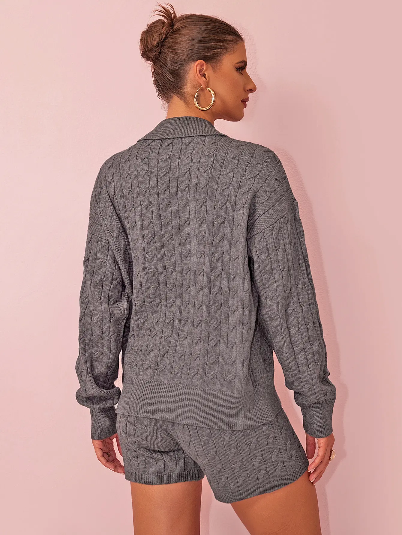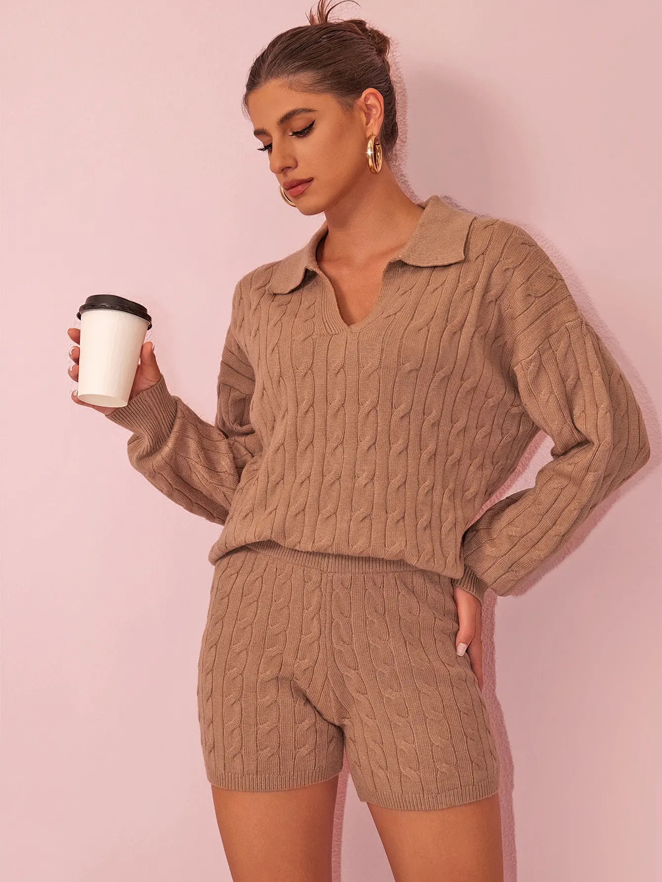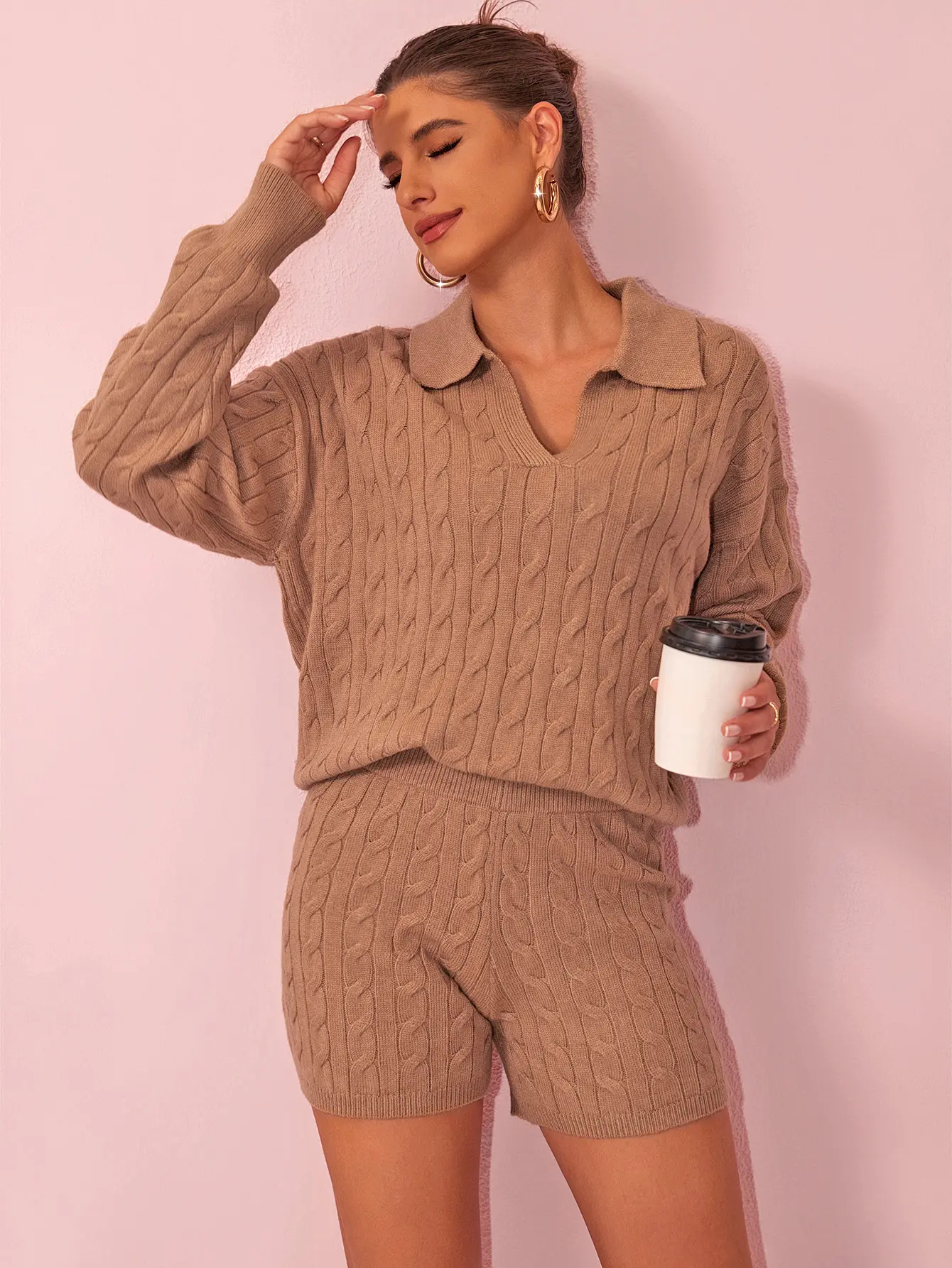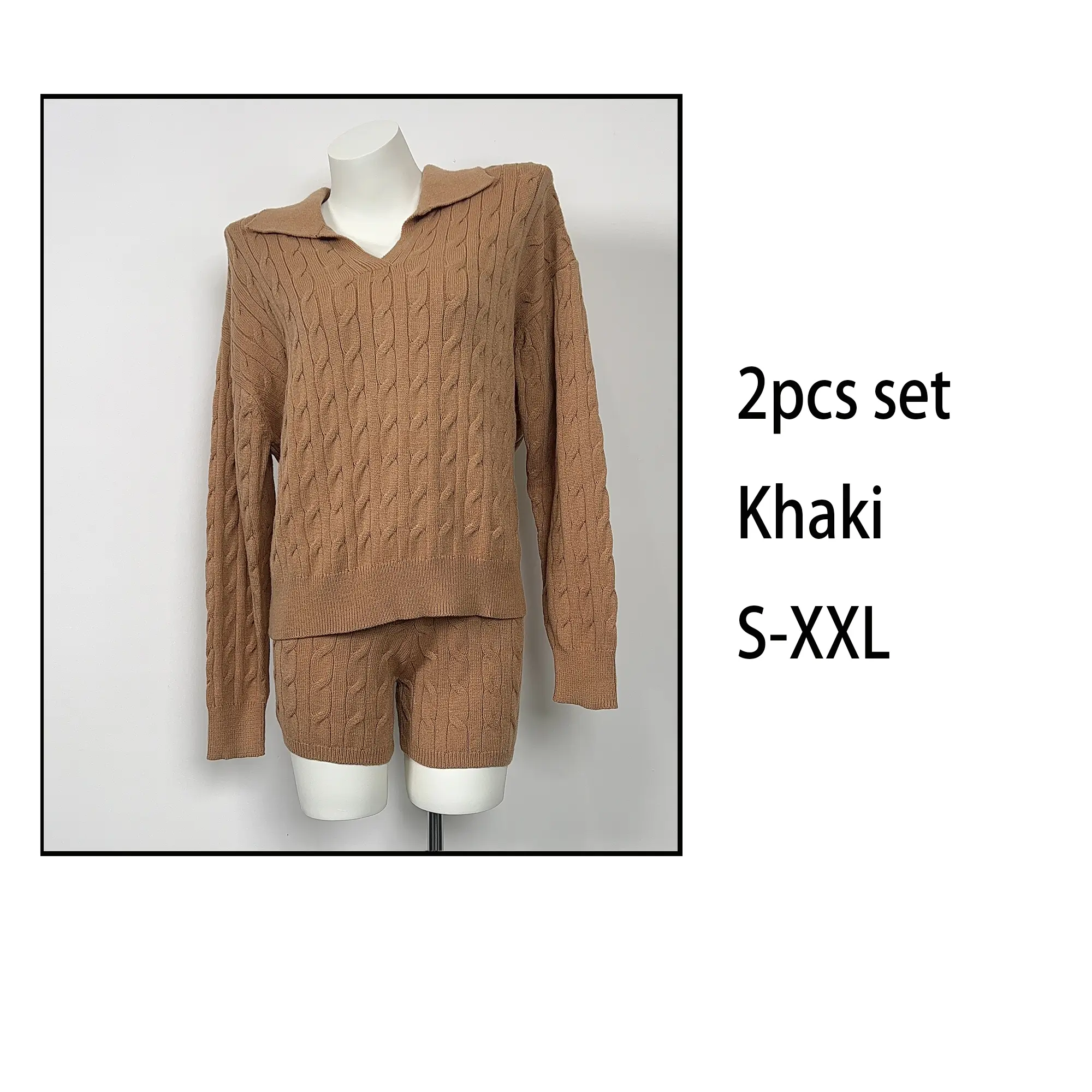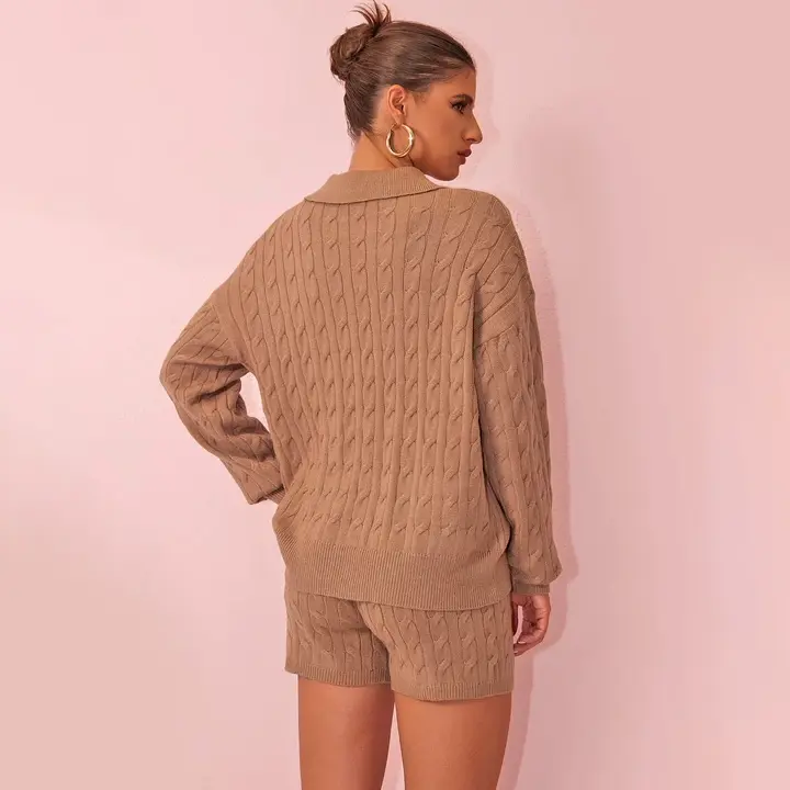 Indulge in comfort and style with our Cable Knit Polo Sweater and Shorts Set. This set features a classic cable-knit pattern, a polo collar on the sweater, and matching shorts. Ideal for creating a cozy and chic look, whether you're relaxing at home, running errands, or meeting friends for a casual coffee. 🌟