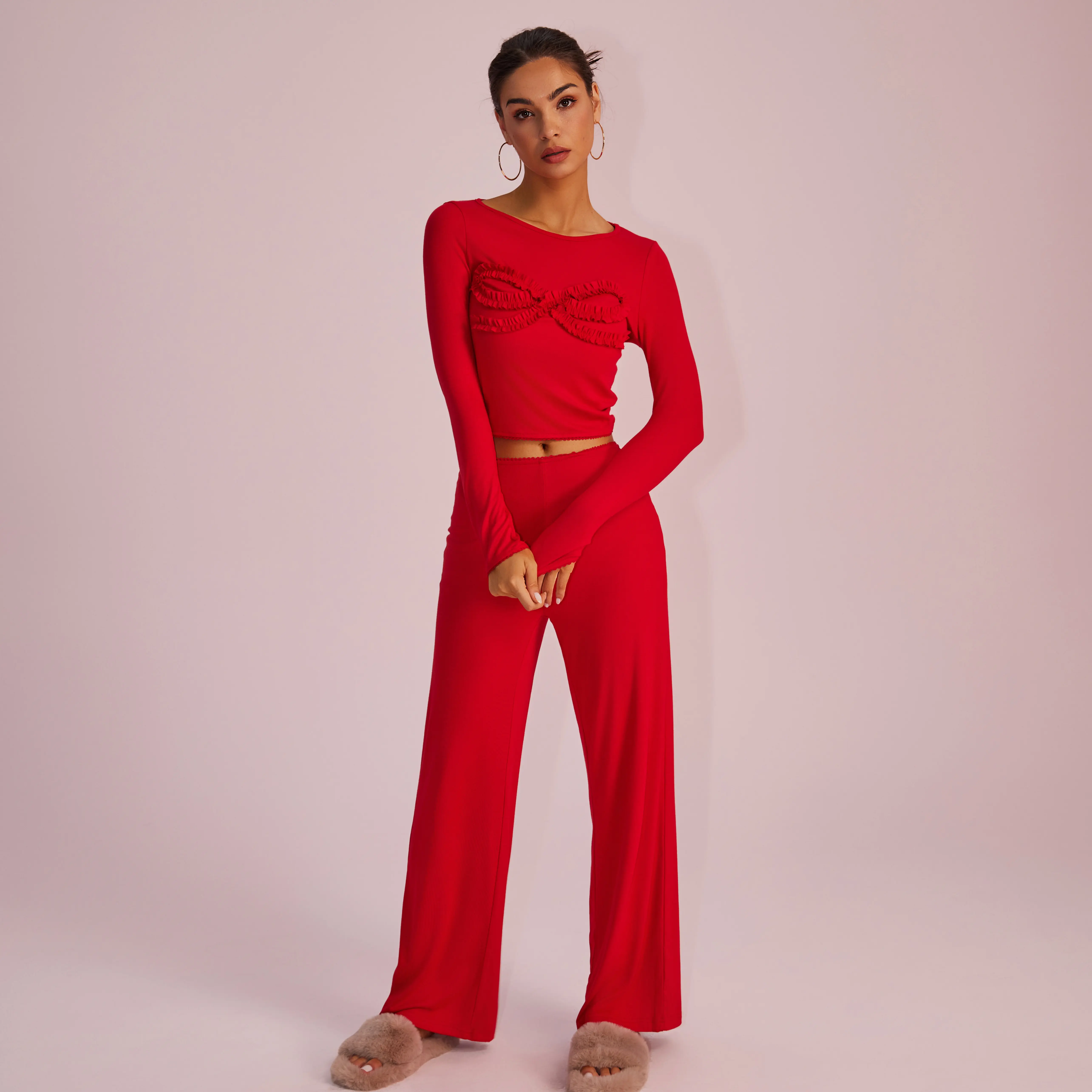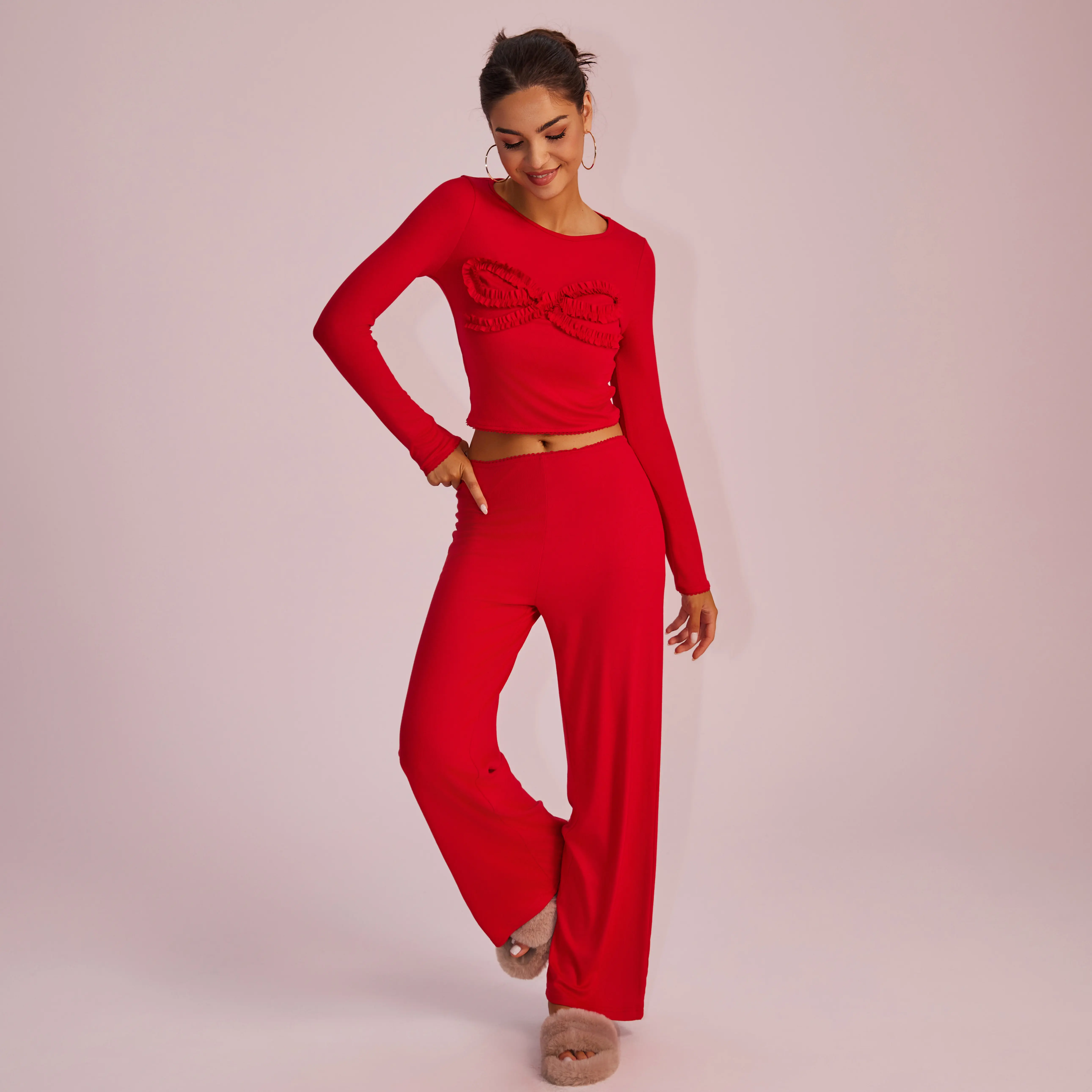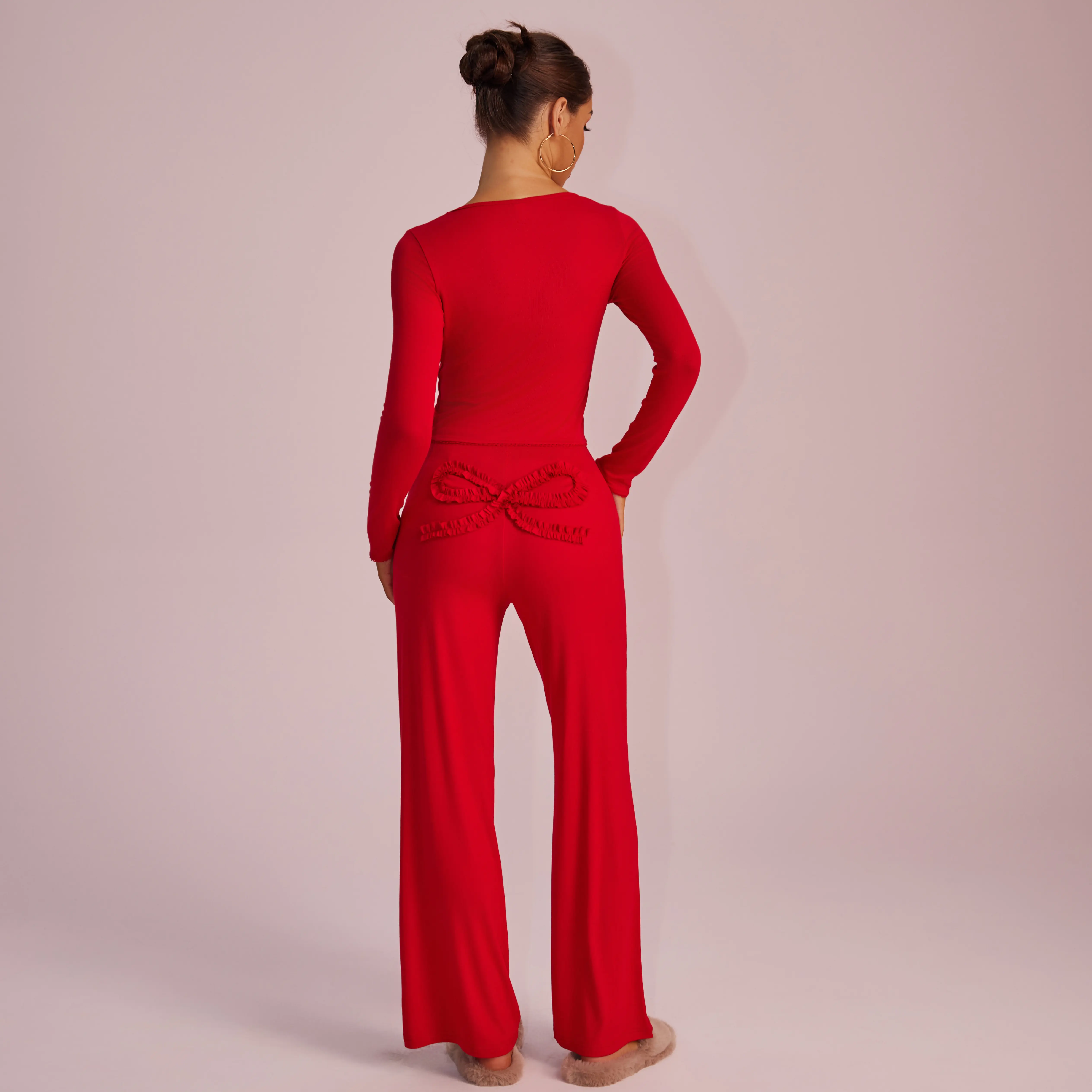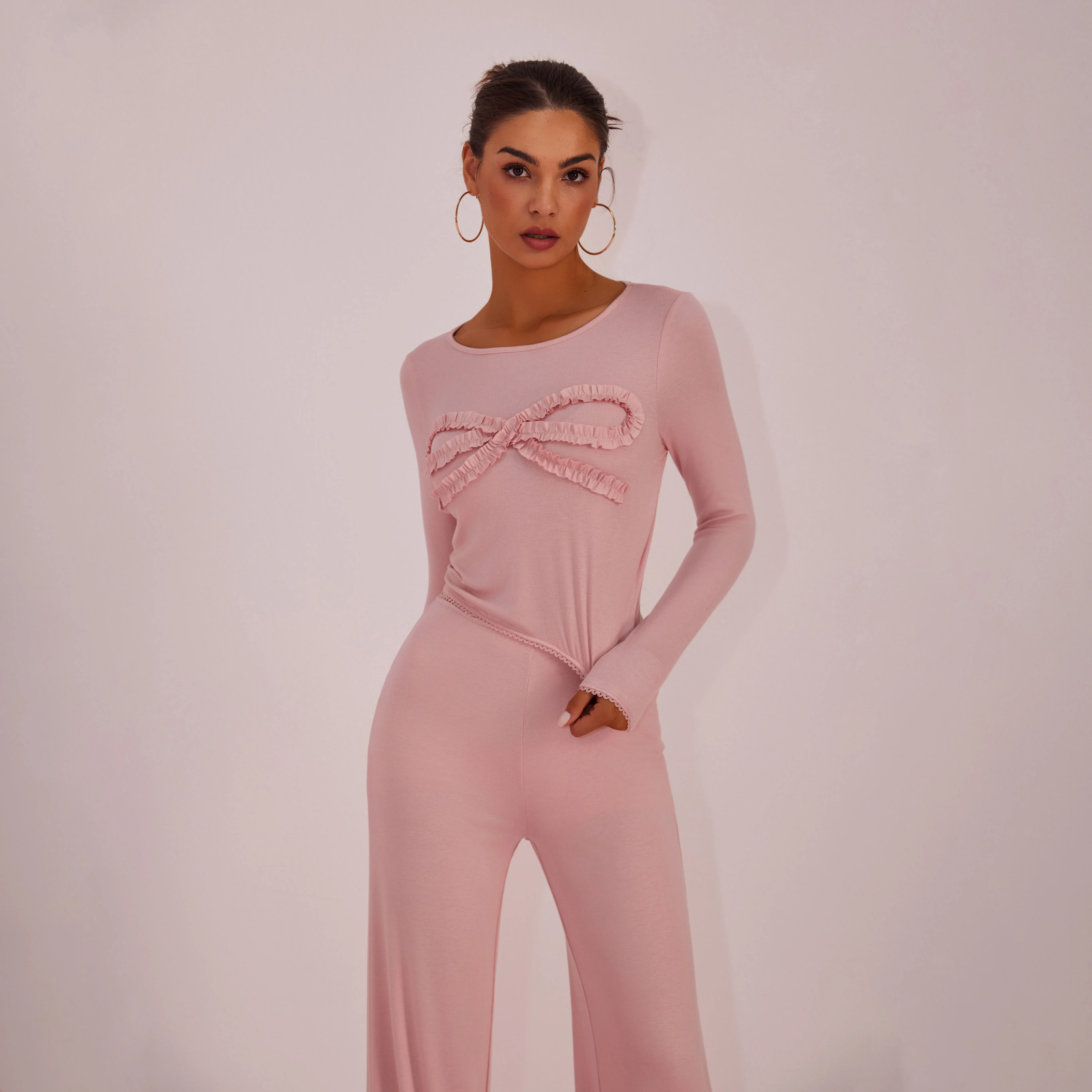 Absolutely love this loungewear! The material is so nice & buttery soft. The pink color is feminine and the bows on the front of the blouse and back of the pants are just adorable. Just like the photos! If you’re thinking about buying this, do it! You won’t be disappointed! True to size.