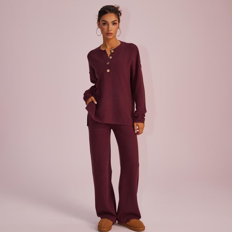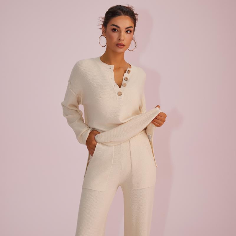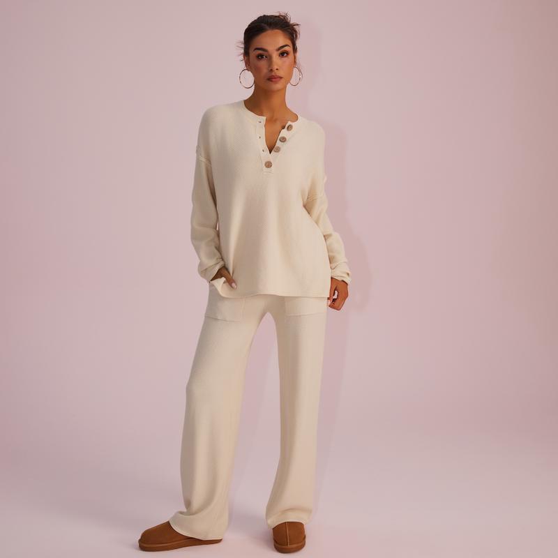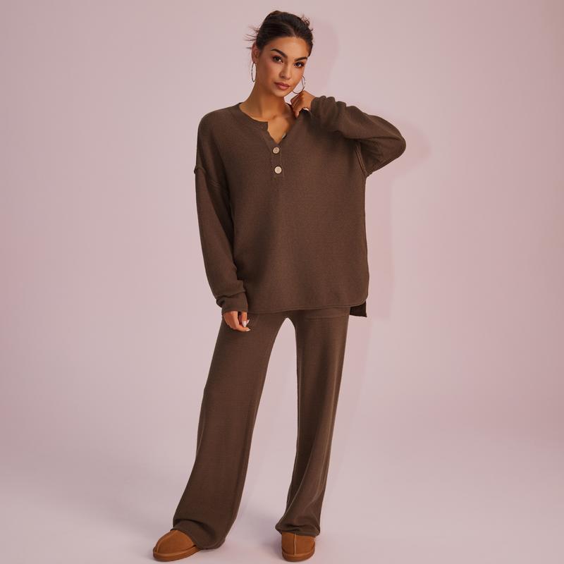 • Front Top: Features a button design for a chic look. • Wide Leg Pants: Offers a relaxed fit for all-day wear. • Waffle Knit Fabric: Provides a soft and comfortable feel.