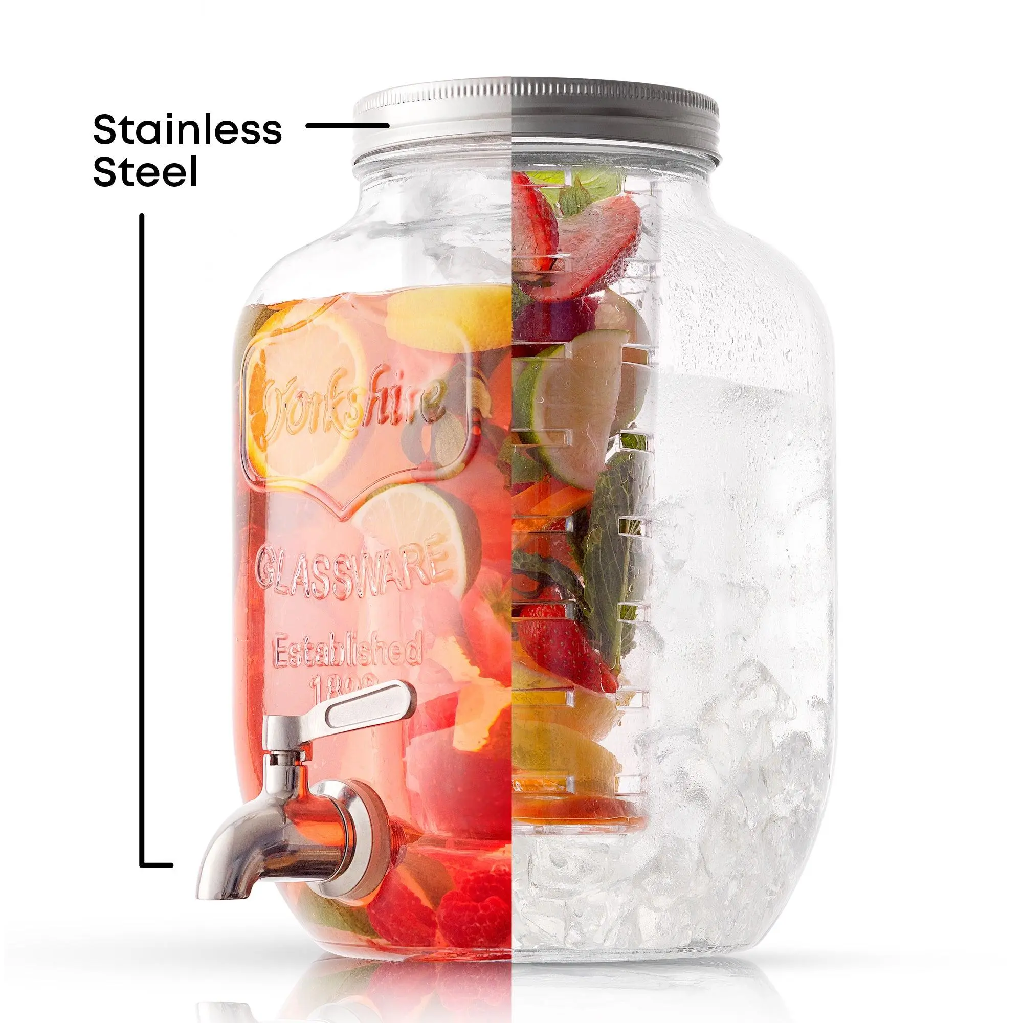 It’s a party in a pitcher! Infuse water with fruit or keep cocktails nice and cold (without dilution!) thanks to the innovative dual infusion system of this leak proof dispenser. This pitcher with spout comes with a leakproof stainless steel spigot, goes from lemonade stand to cocktail party with ease, and fits perfectly on your fridge or countertop. Crafted from durable, lead free glass, it's your key to effortless entertaining and joyful gathering!