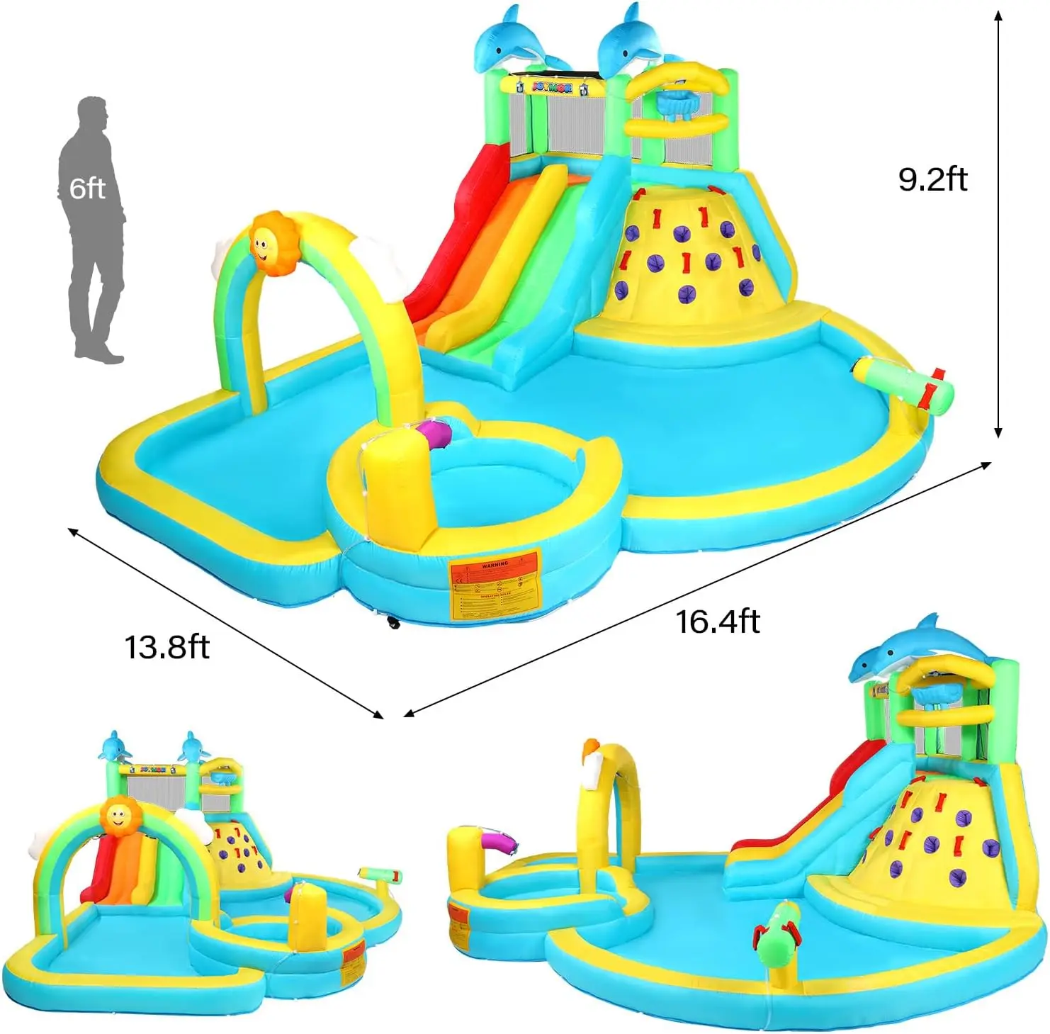 【Unique Design With Lovely Dolphin】Jumping dolphins at the top and the sunshine-rainbow arch sprinklers with bright colors create a Hawaii sun-beach atmosphere for kids on hot summer days. The two identical slides allow two kids to play together. The water bucket at the top of the climbing wall makes the climbing more exciting and challenging. Suitable for kids' birthday party and holiday carnival at backyard.