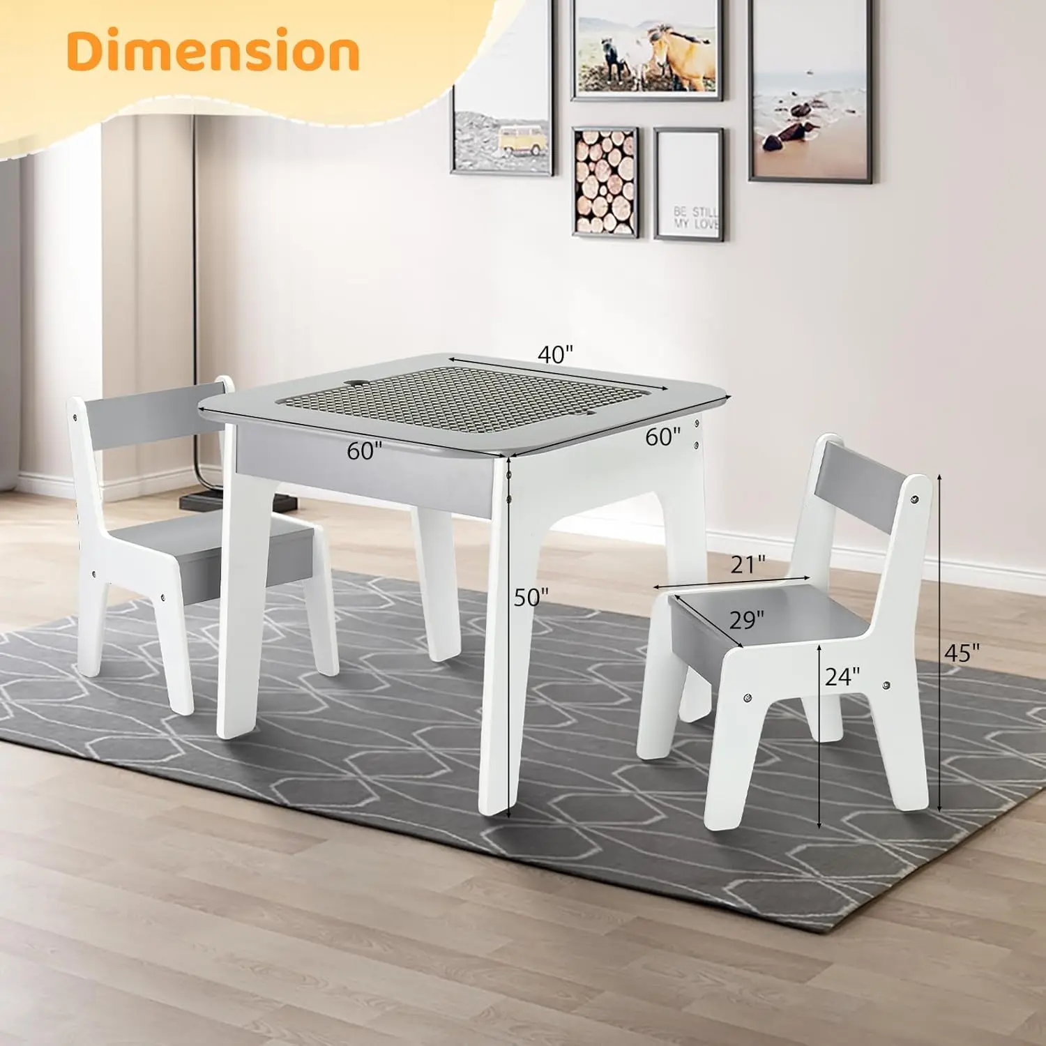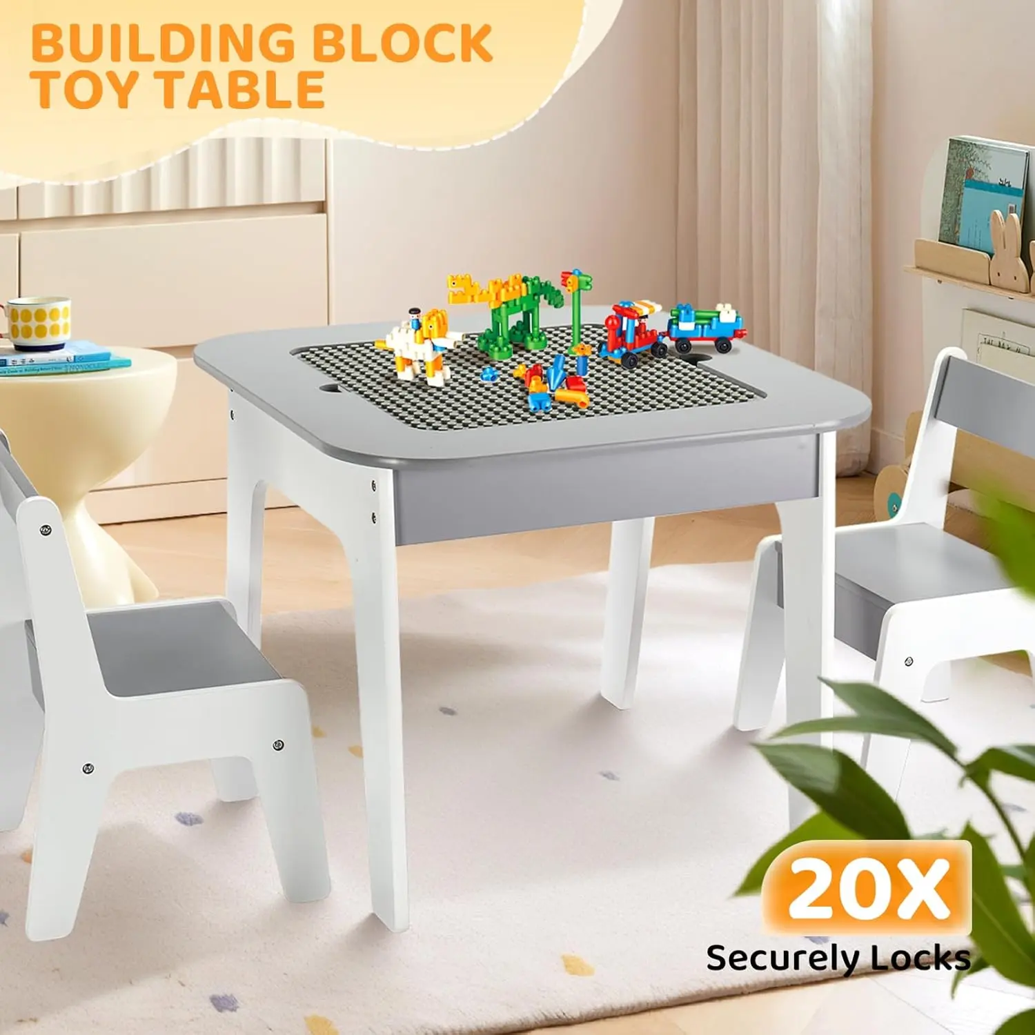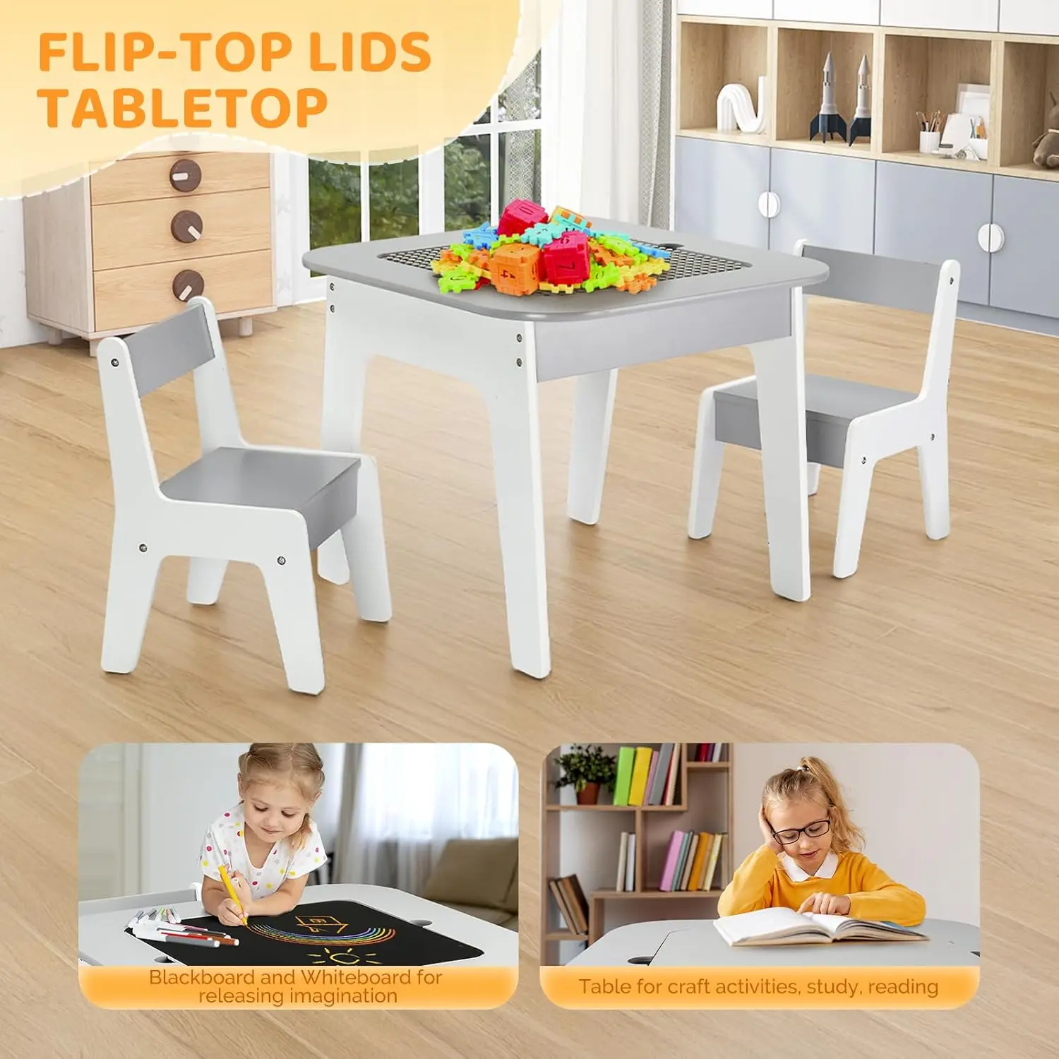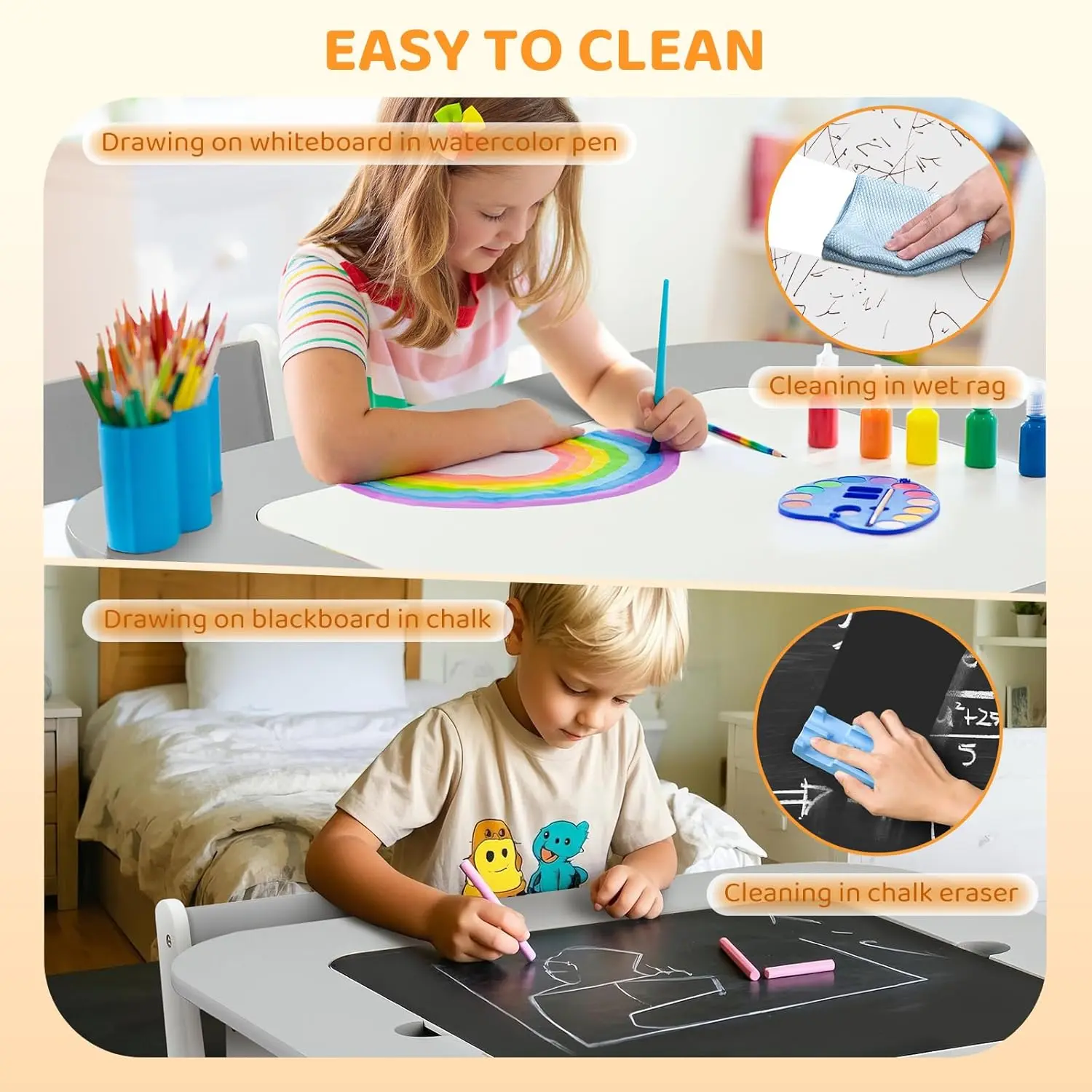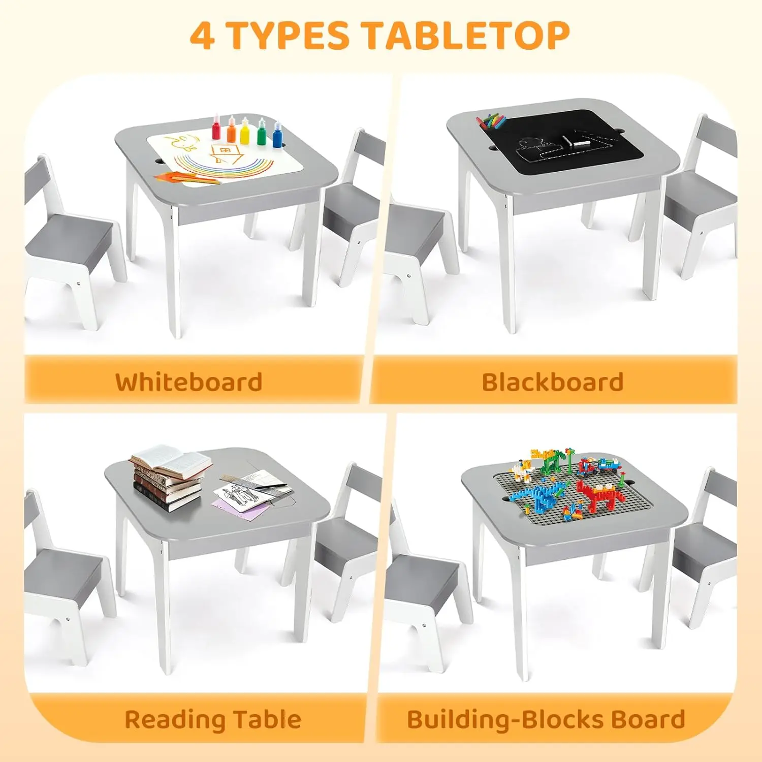 【4-In-1 Tabletops】 The toddler activity table and chair set features a double-sided tabletop design, including 2 double-sided panels with 4 functions: chalkboard, whiteboard, building block board, and flat surface. Your child can freely draw with chalk or water-based markers, build blocks on the block board, or engage in reading and crafting activities on the flat surface.