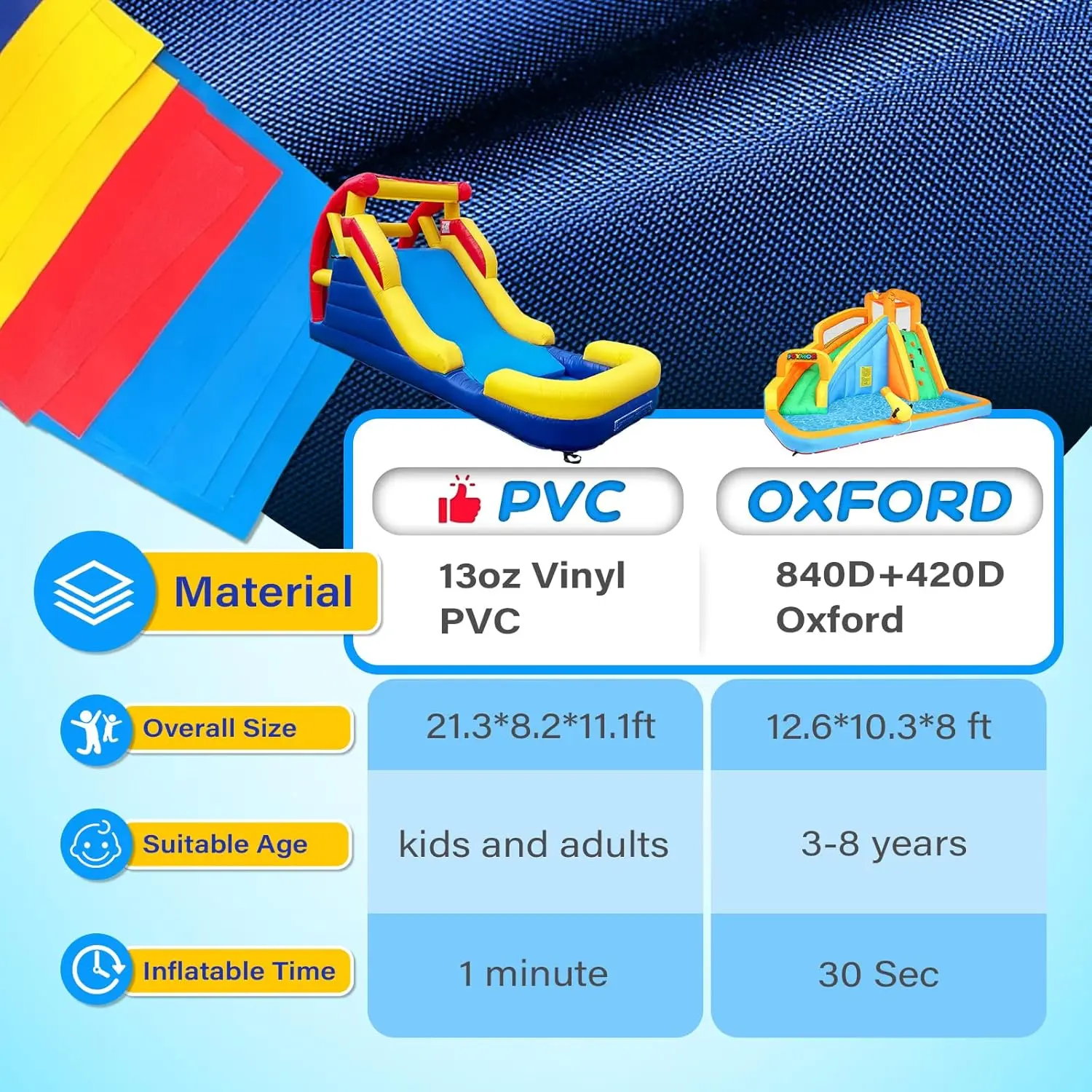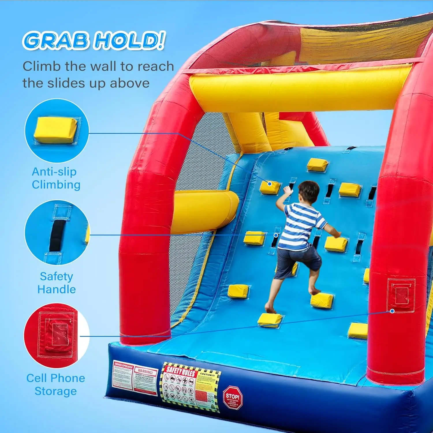 【COMMERCIAL GRADE PVC MATERIAL】: Constructed with commercial grade PVC vinyl, it is more durable, stronger and tear resistant than standard nylon residential inflatable bounce houses, and can last longer with frequent use. All high stress areas are made of industrial strength 13 oz) multi-layer PVC with double to quadruple stitching. This includes the climbing wall, the bottom and the slide surface.