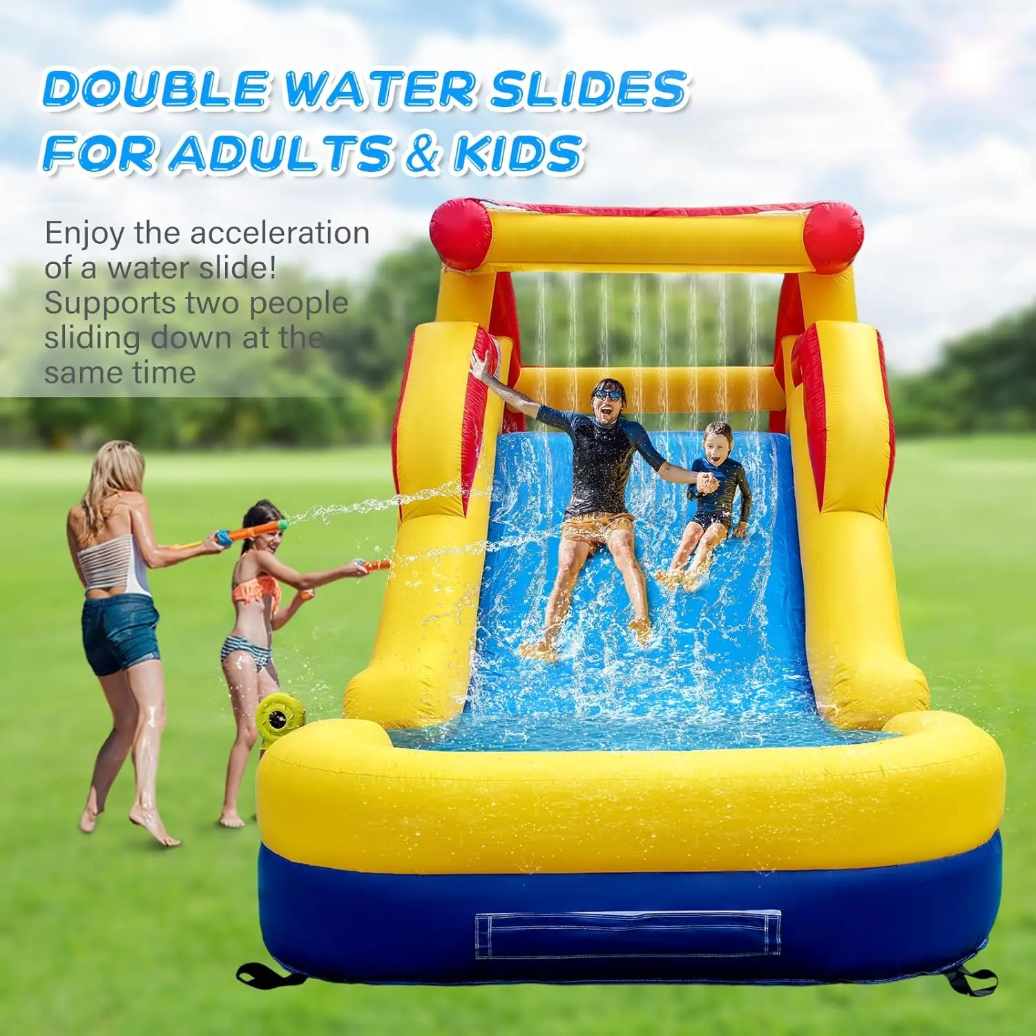【DOUBLE WIDE SLIDE】- This double wide water slide allows up to two adults to climb and slide down at the same time and has built-in water spray device for an amazing water slide experience. Kids can have extra fun by engaging in a variety of activities such as climbing, sliding and splashing! With this water slide, kids will have fun on it for hours.