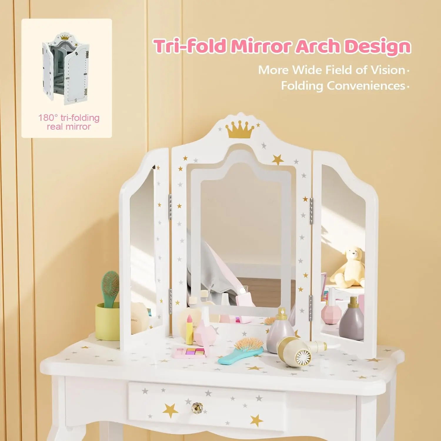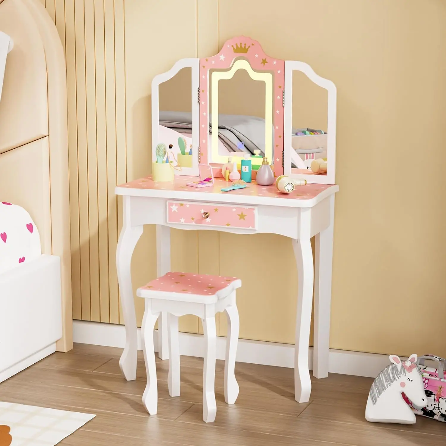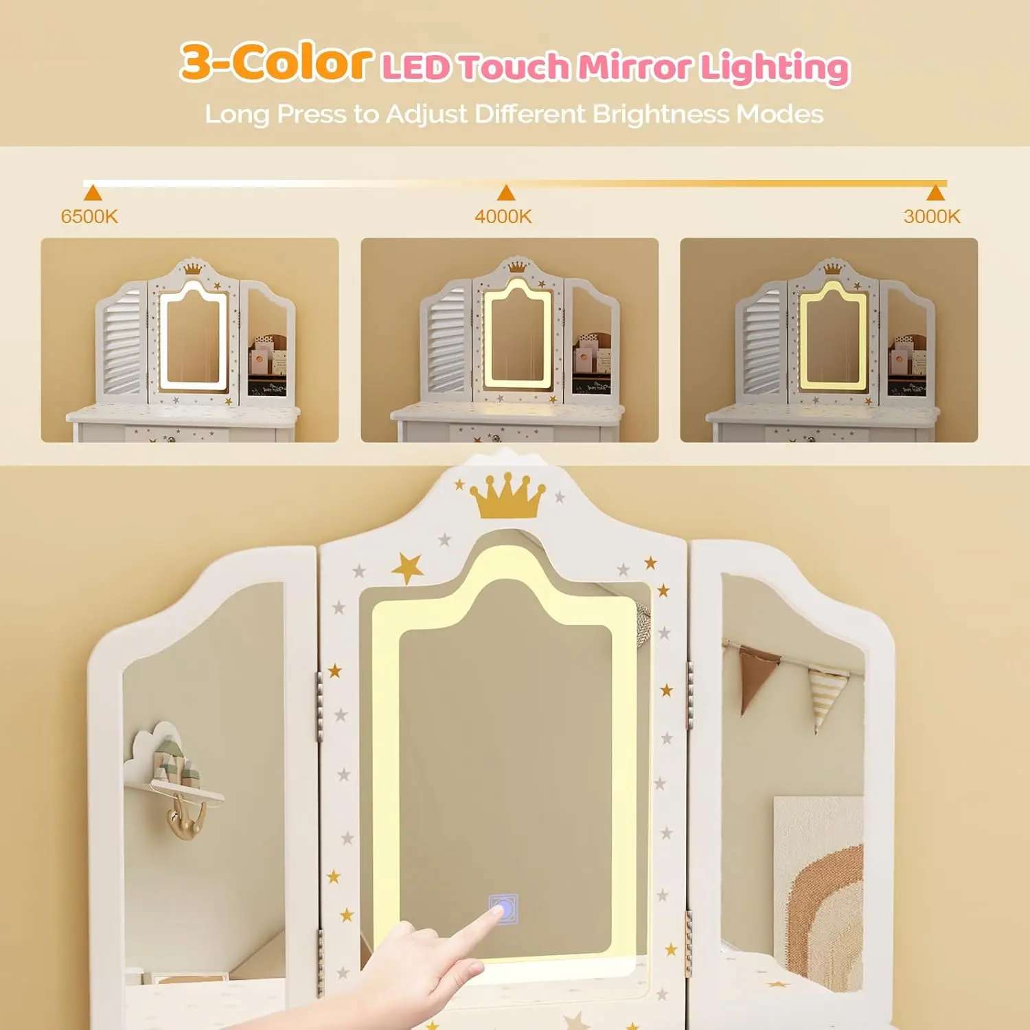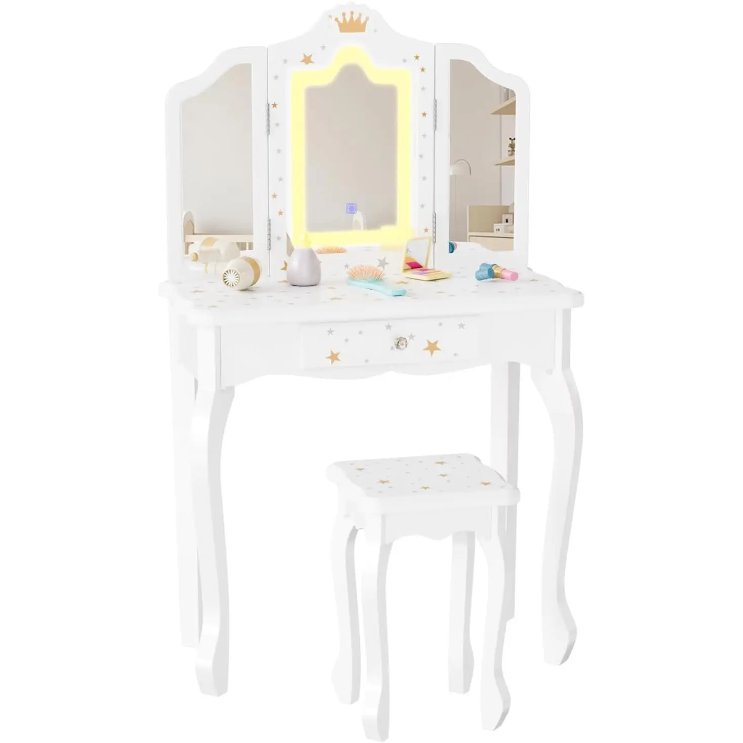 JOYMOR Upgrade Kids Vanity, 2-in-1 Girls Vanity w/Tri-Folding Mirror & Adjustment LED Touch Screen, 1 Drawer, Kids Vanity Set with Mirror Age 4-9 (White)JOYMOR Upgrade Kids Vanity, 2-in-1 Girls Vanity w/Tri-Folding Mirror & Adjustment LED Touch Screen, 1 Drawer, Kids Vanity Set with Mirror Age 4-9 (White)