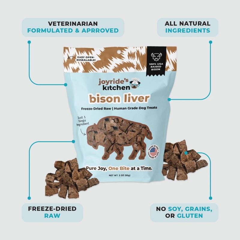 Freeze-Dried Bison Liver Dog Treats (3 oz). A simple, single-ingredient dog treat made from 100% bison liver. Freeze-dried to preserve natural flavor and nutrients. Crunchy, highly palatable, and easy to break into smaller pieces. Bison liver provides the same core nutrients as other liver treats but comes from a lean, novel protein source. It is a great option for protein rotation and a beef-free alternative for dogs that avoid beef. Contains 100% bison liver with no grains, fillers, or artificial ingredients. Suitable for dogs of all breeds and sizes when fed as an occasional treat.
