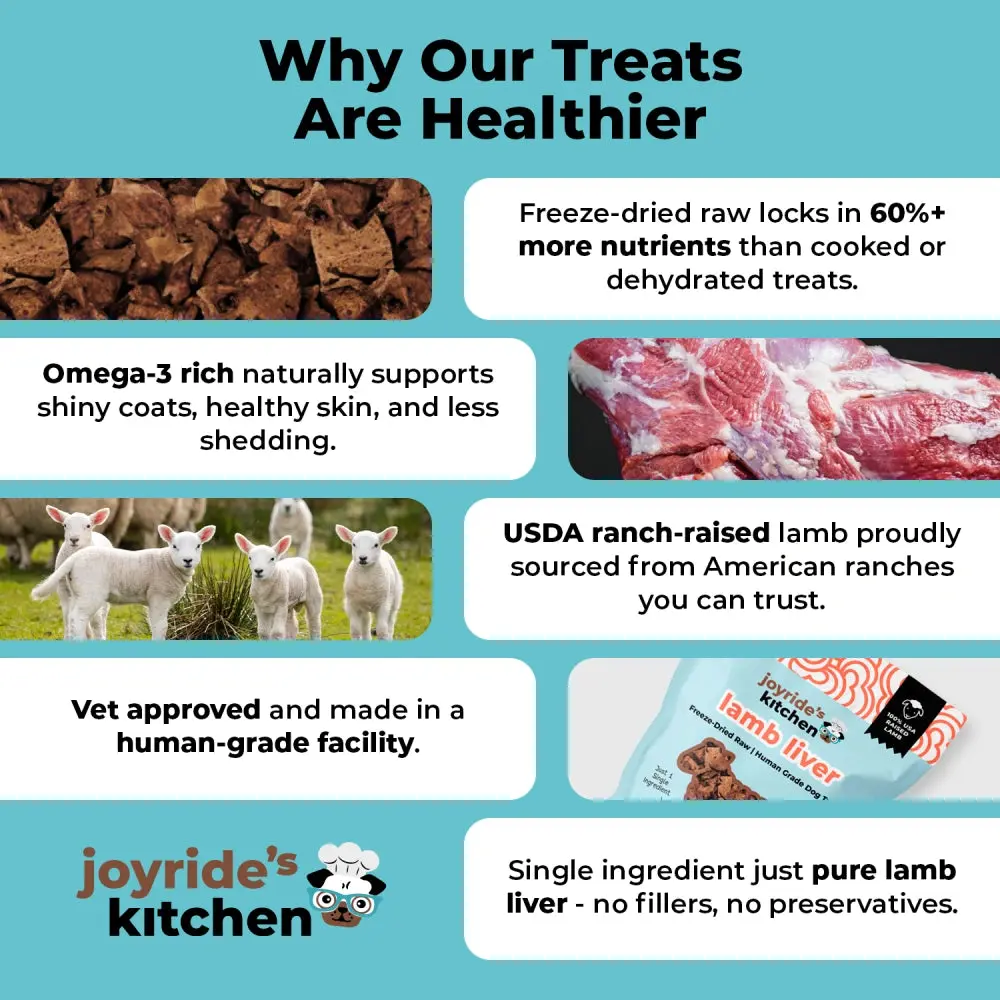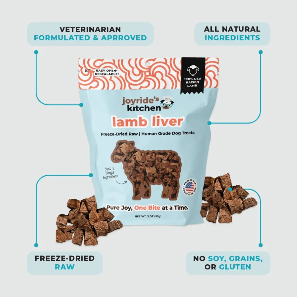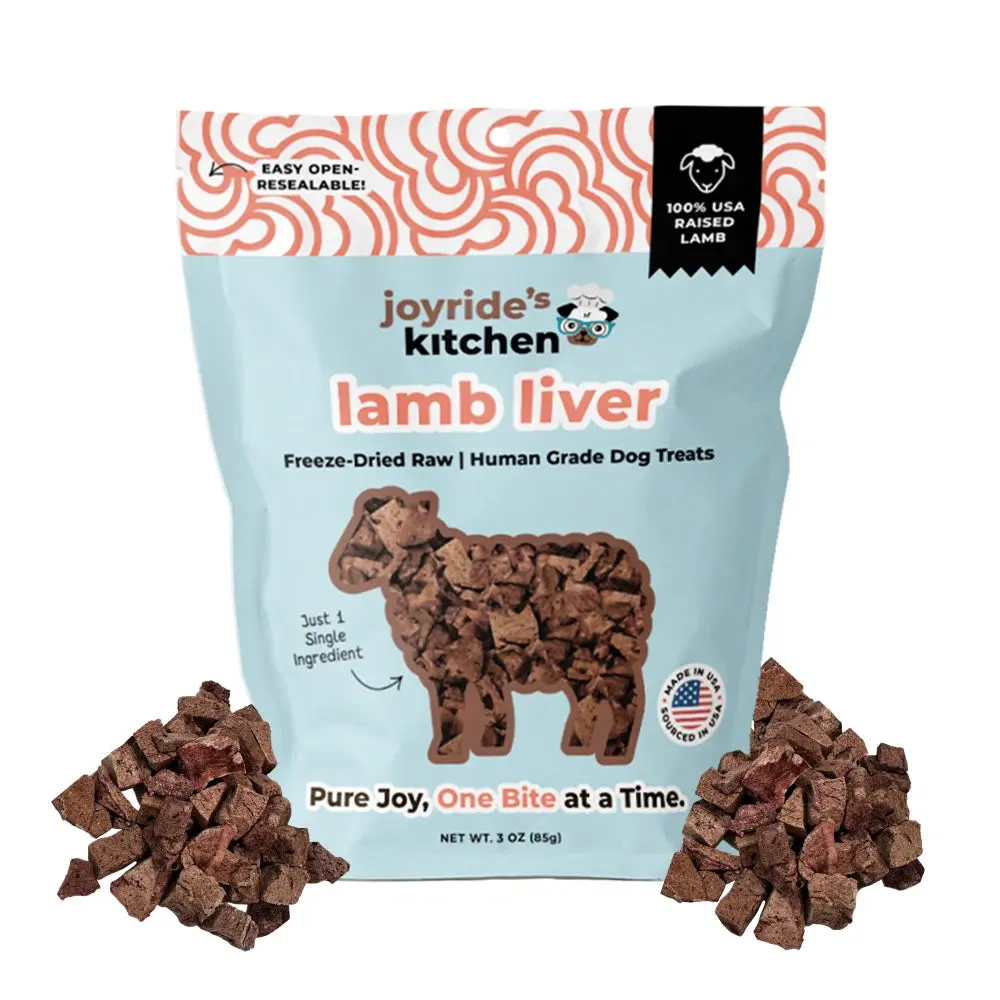 Freeze-Dried Lamb Liver Dog Treats (3 oz). A simple, single-ingredient dog treat made from 100% lamb liver. Freeze-dried to preserve natural flavor and nutrients. Crunchy, highly palatable, and easy to break into smaller pieces. Lamb liver provides the same core nutrients as beef or bison liver but is simply a different protein source.