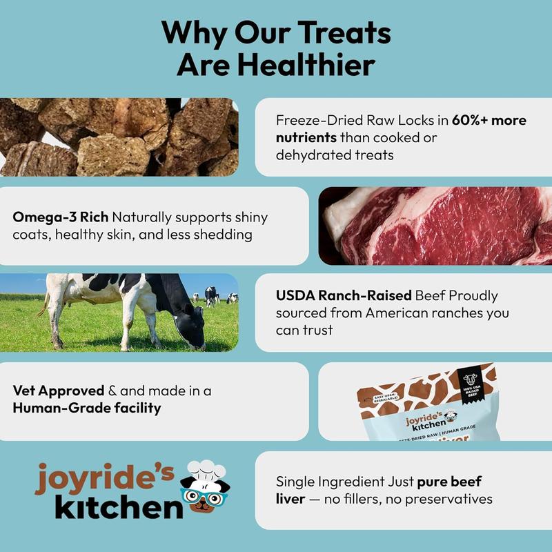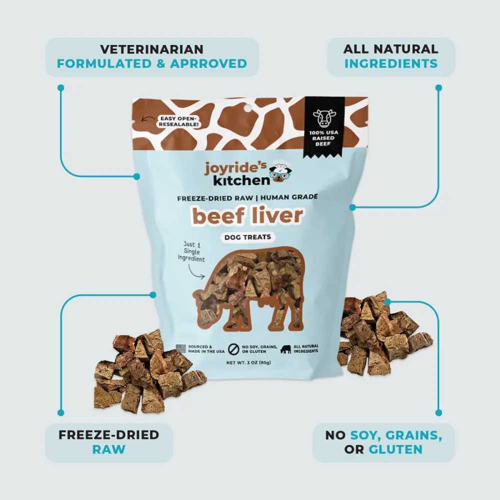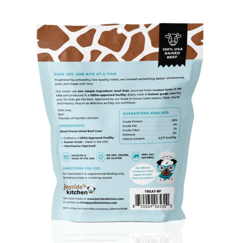 Frustrated by unhealthy treats? Joyride's Kitchen offers wholesome, pure beef liver treats. Sourced from trusted USA farms, these treats are made in a USDA-approved, human-grade facility. They are clean, safe, and nutritious. Approved by our taste testers, they are delicious and nutritious. Crafted with responsibly sourced USA ranch-raised beef.