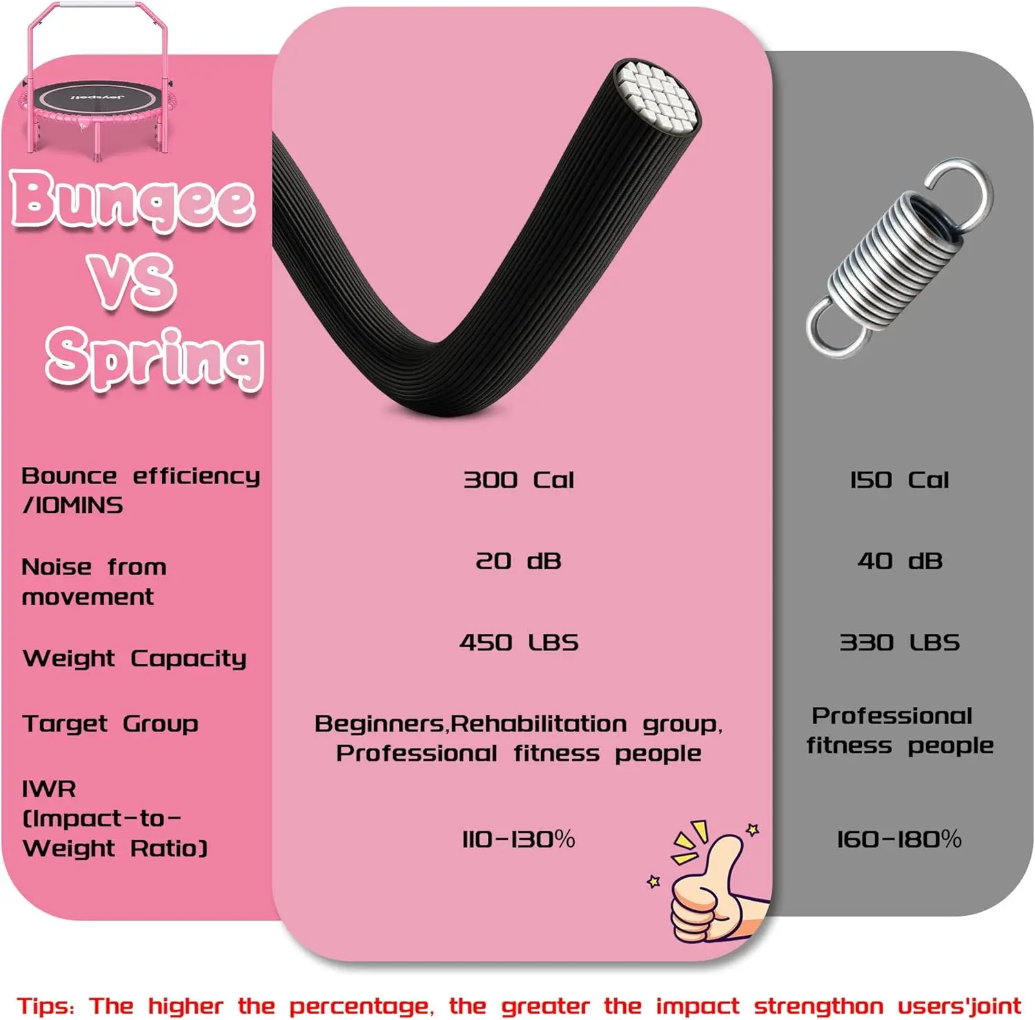 ·【Ultra-Quiet Bungee System - Bounce Without Noise】Our premium synthetic bungee cords absorb up to 85% of shock and vibration, creating a noise-free experience perfect for apartments or shared spaces. Unlike noisy spring trampolines, this design ensures a smooth, silent workout that won’t disturb your family or neighbors
