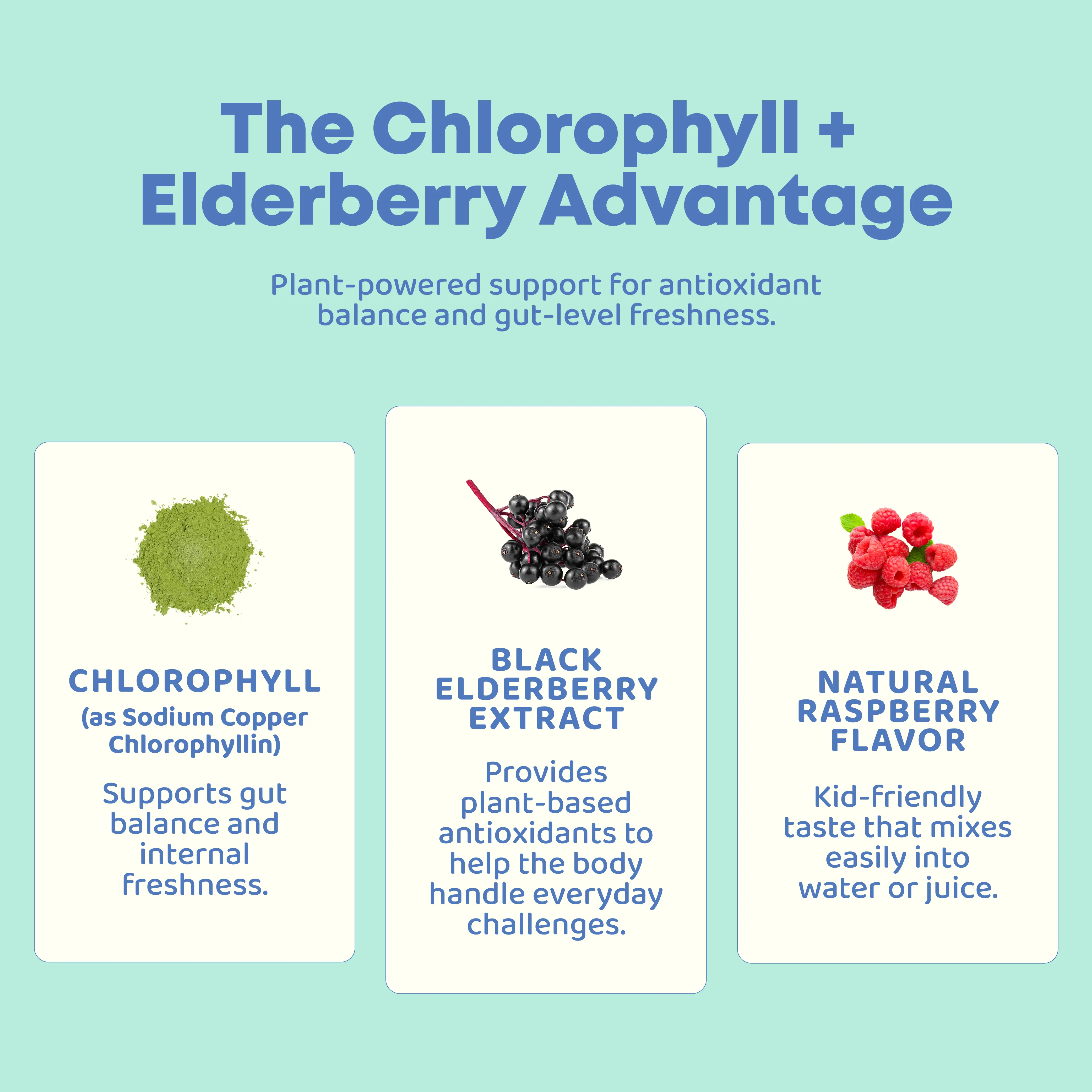 • Plant-Based Antioxidant Support – Chlorophyll and elderberry provide gentle antioxidant activity to help the body manage everyday environmental stressors.