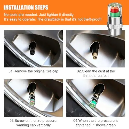 Simply install these caps on your vehicle tires. The vibrant colors make it easy to identify and relieve stress. Keep your tires at their best with Joytutus' reliable solution. No more guessing tire pressure! 🛠️✅