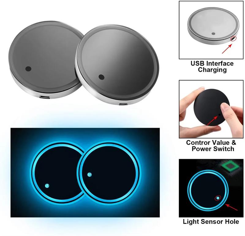 The Joytutus Solar Powered Color Changing LED Cup Holder Mat is a versatile car accessory. It comes with cup holder mat and bottle sensor light. This universal accessory features colorful LED lights to enhance your car's atmosphere. Perfect for adding a touch of brightness and style to your vehicle.