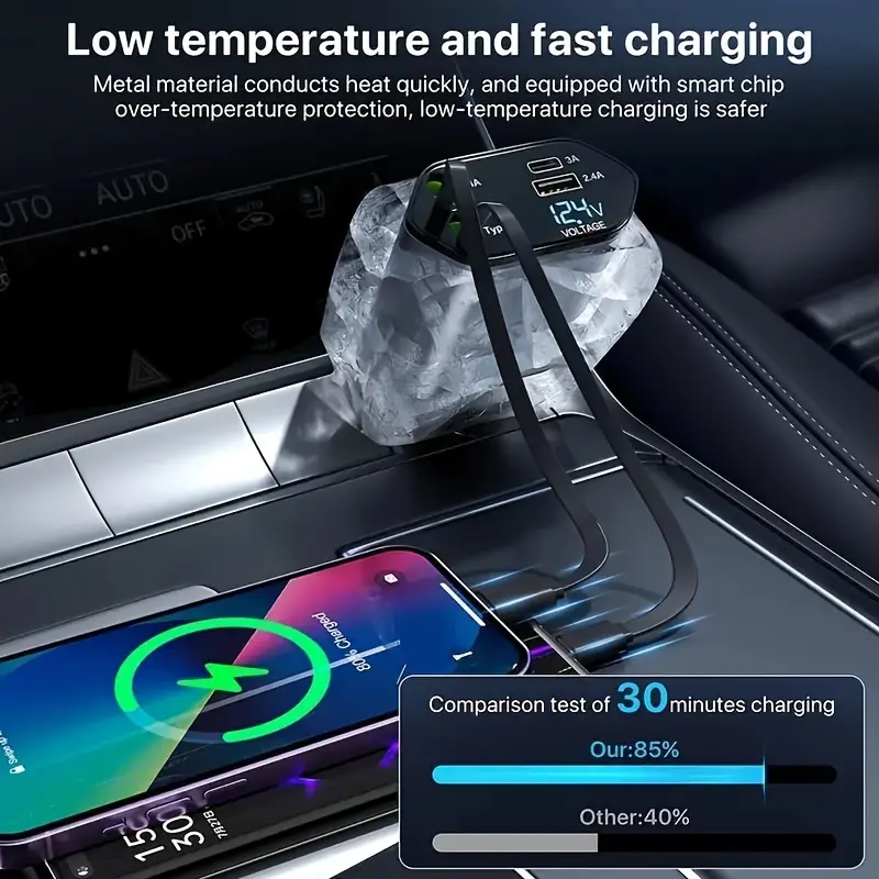 Equipped with 120W power and USB-C and USB ports, it safely charges up to 4 devices simultaneously. It's 5 times faster than ordinary car chargers. You won't have to wait when you urgently need to charge your devices. Stay connected without delays.