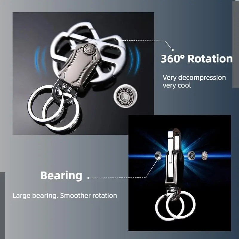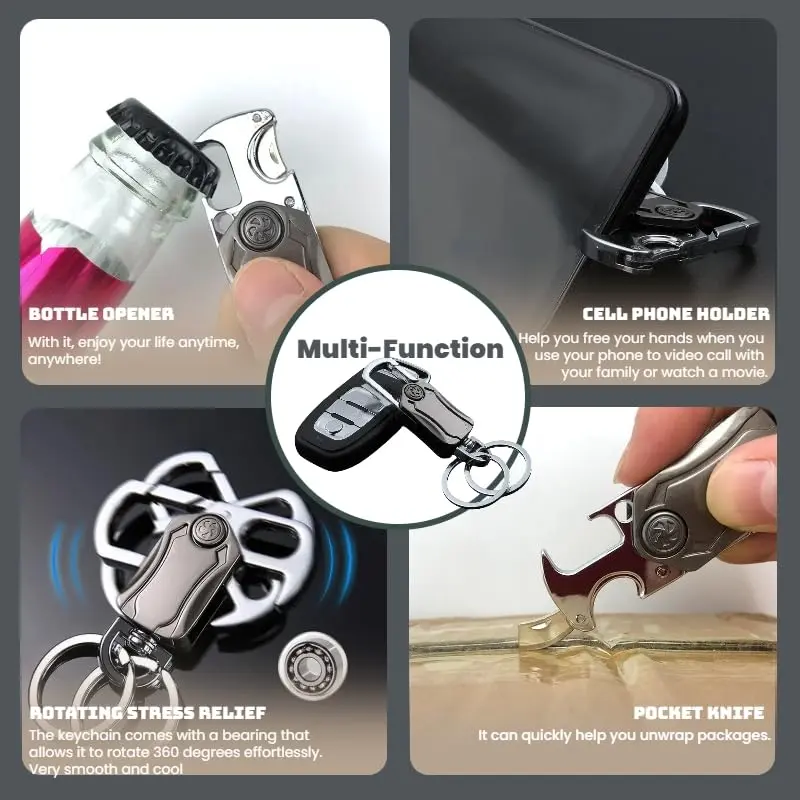 The image shows the keychain key ring with a carabiner clip, bottle opener, and fidget spinners. It is compact and designed for car keys. 📸