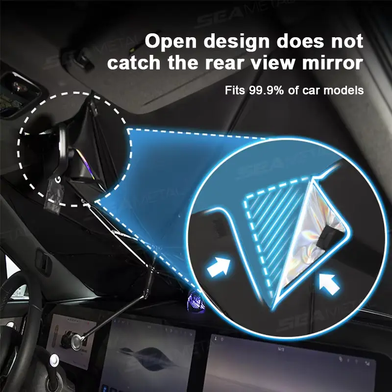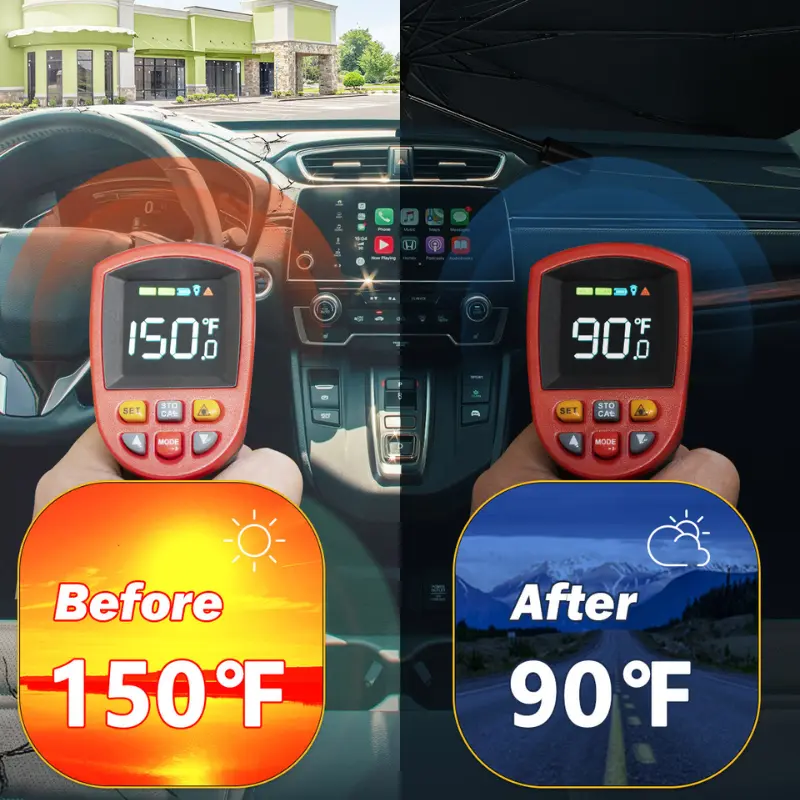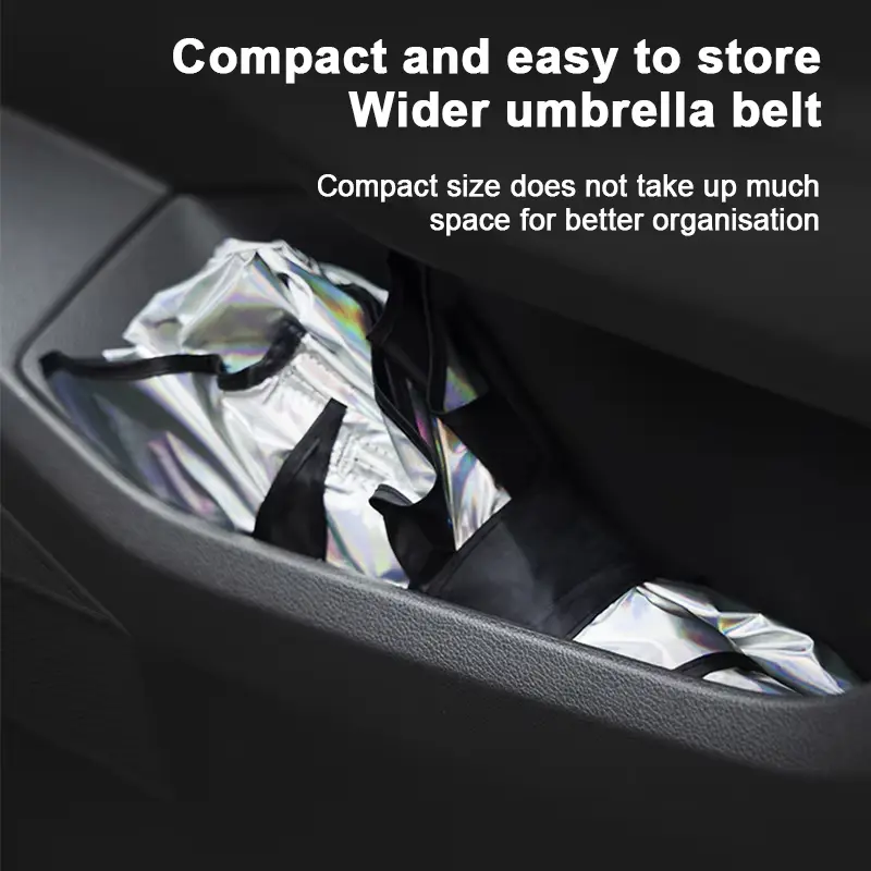 ·Place it over your dashboard and open it like an umbrella. When not in use, it folds down to less than 1 square foot for convenient storage in your door panel, central control, or glove box.