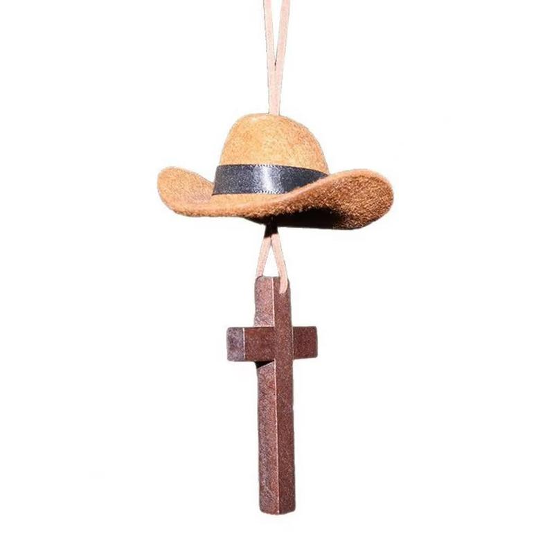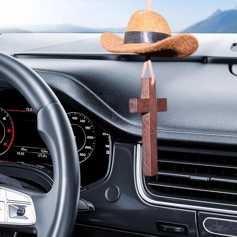 JOYTUTUS Western Style Cowboy Hat Car Pendant Charm for Rear View Mirror Women's Automobile Hanging Decor with Wooden Cross Accent