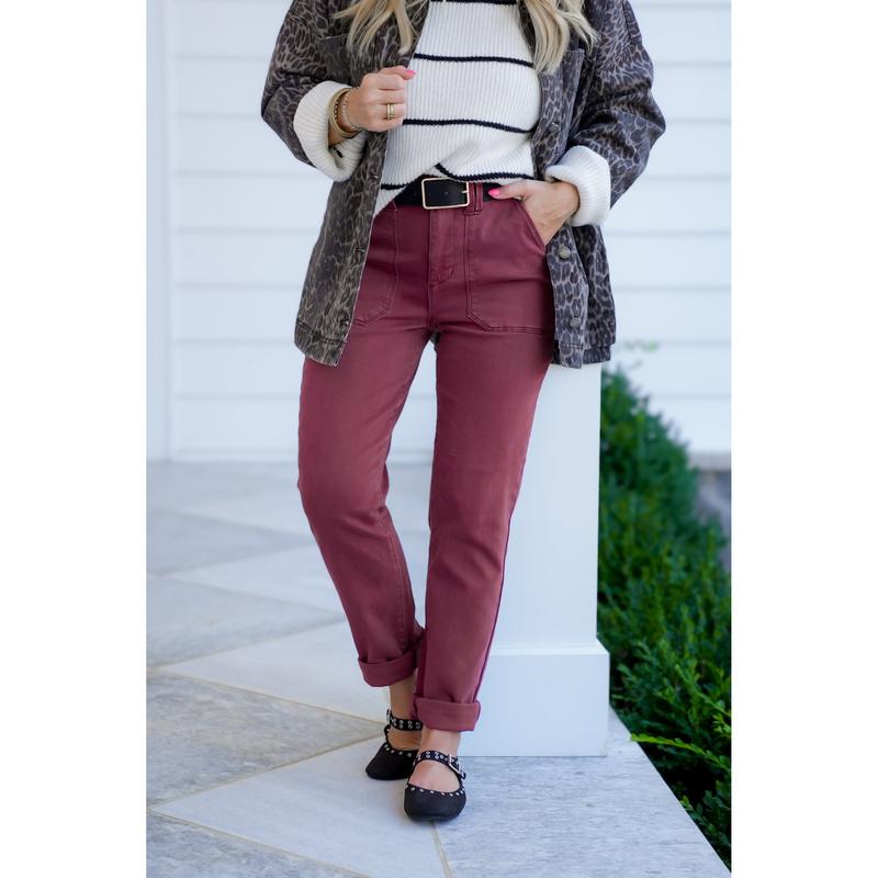 Make room in your closet, these Judy Blue burgundy cuffed jeans are the pair you’ll be living in this season. The high rise gives you that ultra-flattering silhouette while the deep burgundy wash adds a rich pop of color that makes any outfit stand out.