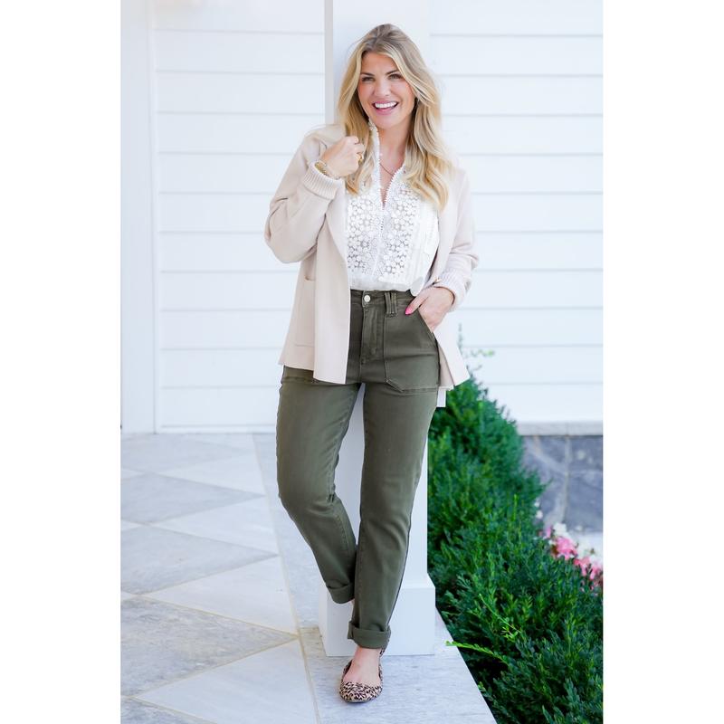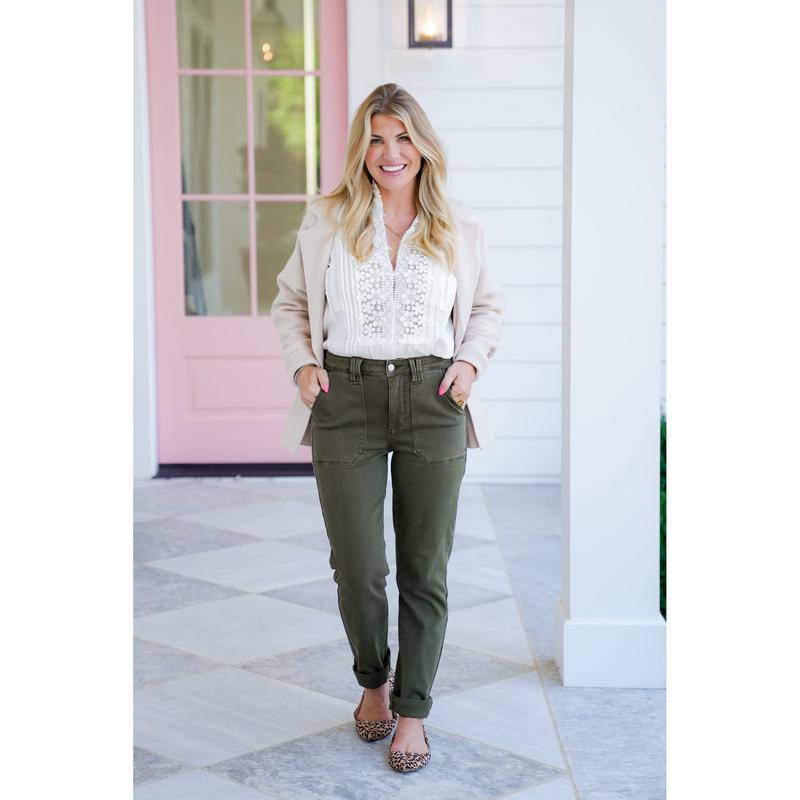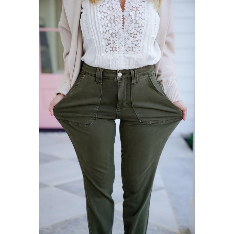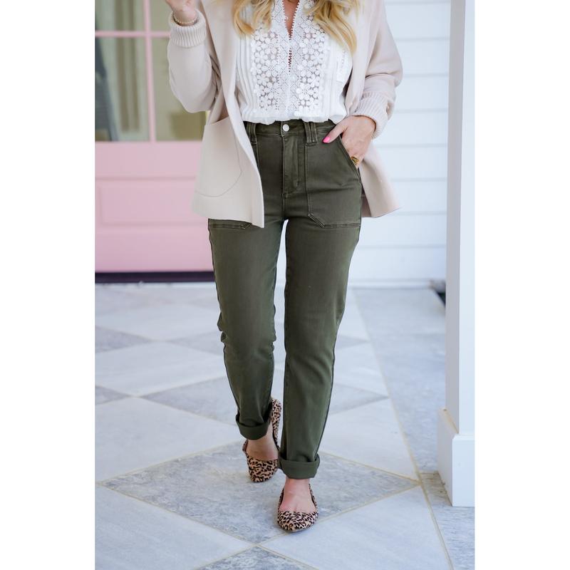 These Judy Blue green cuffed jeans are the style upgrade your closet has been craving! The high-rise design smooths and flatters, while the unique green tone brings a fresh, modern twist to denim. With trouser-inspired pocket details and a sewn cuff, these jeans strike the perfect balance between casual chic and polished style. Dress them up with a feminine blouse and heels or keep it relaxed with sneakers and a graphic tee, you’ll love how versatile they are.