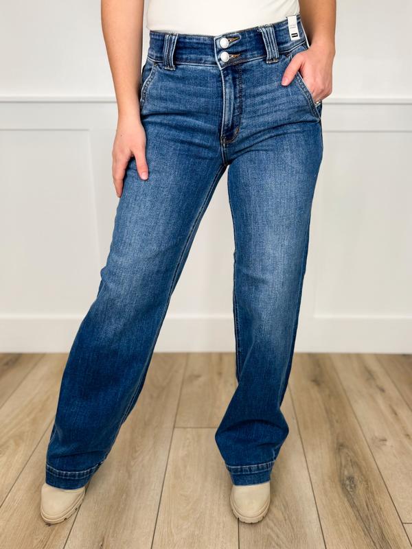 Step into effortless style with these Judy Blue Kira high-rise wide leg jeans! The medium wash with light contrast detailing gives you that perfect balance of classic and contemporary—ideal for dressing up or keeping it casual. The double button design adds a touch of vintage charm, while the relaxed wide-leg silhouette keeps things comfy and on-trend. Whether you're pairing them with sneakers or heels, these jeans are your new go-to for looking put-together without trying too hard.