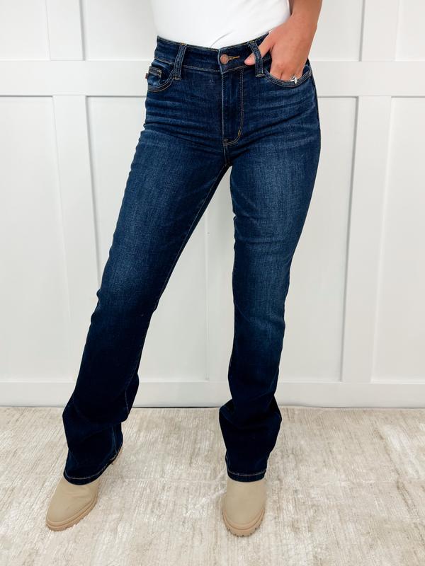 These Judy Blue Trish Mid Rise Bootcut Jeans in a dark wash offer a refined silhouette perfect for everyday wear. Designed with a flattering mid-rise fit and subtle bootcut flare, they provide both comfort and style. Their versatile dark wash makes them an elegant choice for dressing up or down, ensuring a polished look for any occasion.